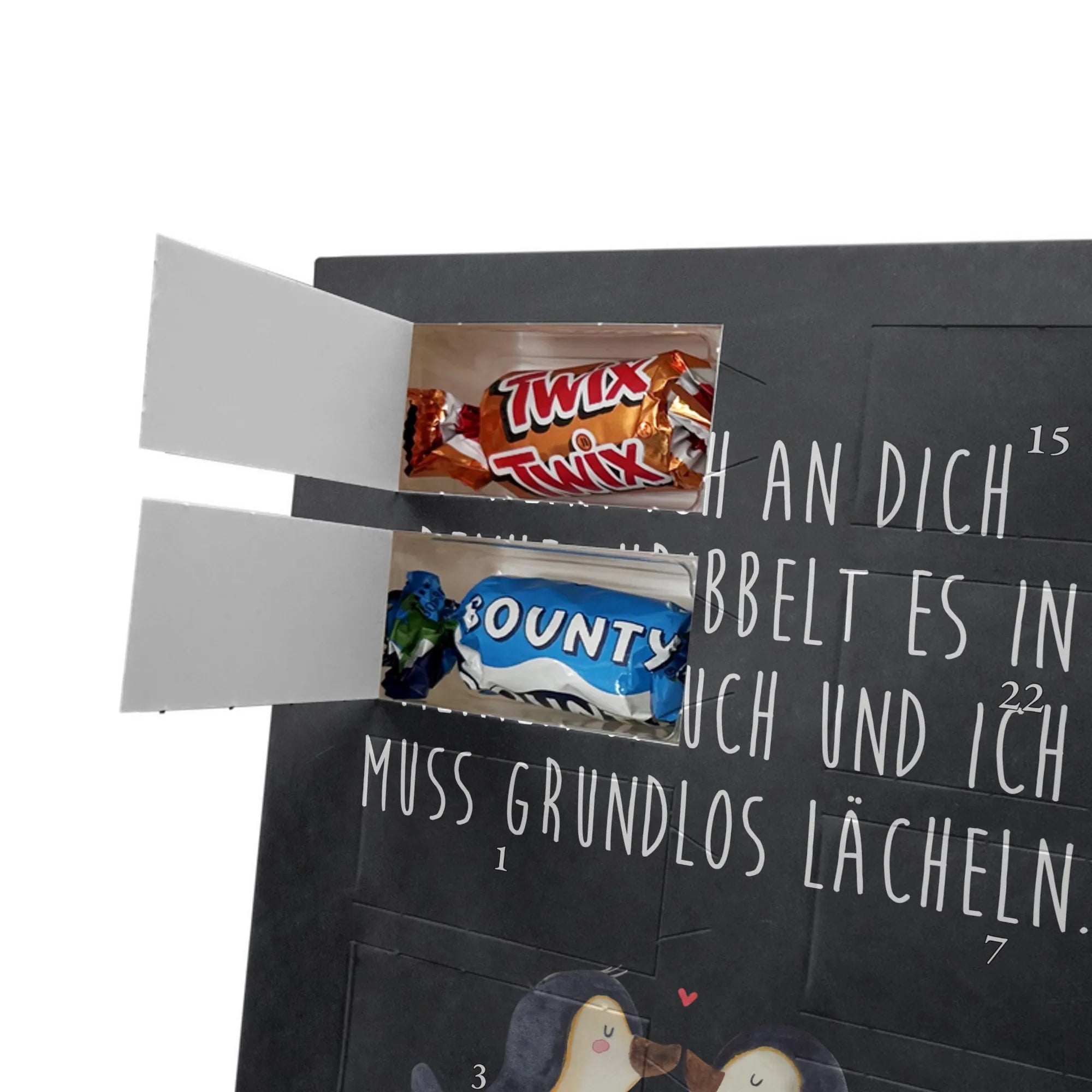 Zauberhafter Personalisierter Schoko-Foto-Adventskalender von Mr. & Mrs. Panda – das ideale Geschenk für Freunde und Familie! Der Kalender kombiniert die süße Vorfreude auf Weihnachten mit einem ganz persönlichen Foto, das du beim Bestellen hochlädst. Unsere Designs und liebevollen Sprüche von Mr. & Mrs. Panda zieren jede Seite. Achte darauf, ein Foto mit hoher Auflösung zu verwenden, damit das Druckbild klar und detailreich bleibt. Prüfe den Bildausschnitt, damit Gesichter und wichtige Details nicht abgeschnitten werden. Lade nur Bilder hoch, bei denen du die Rechte besitzt oder die Erlaubnis zur Nutzung hast. Die Drucke sind brillant mit seidenmatter Veredelung, auch die Seitenflächen sind bedruckt und geben dem Kalender ein hochwertiges Finish. Maße: 325 mm x 225 mm x 27 mm. Du kannst den Kalender aufhängen oder dekorativ aufstellen – beides möglich. Wichtiger Hinweis: Fotos werden nicht nachbearbeitet oder zugeschnitten; personalisierte Artikel sind vom Widerruf ausgeschlossen. Gefüllt ist der Kalender mit Celebrations Schokolade: 24 leckere Überraschungen in 8 Sorten (Maltesers, Mars, Snickers, Twix, Milky Way, Bounty, Galaxy, Galaxy Caramel). Ein persönliches, liebevolles Geschenk, das Erinnerungen und Genuss verbindet.