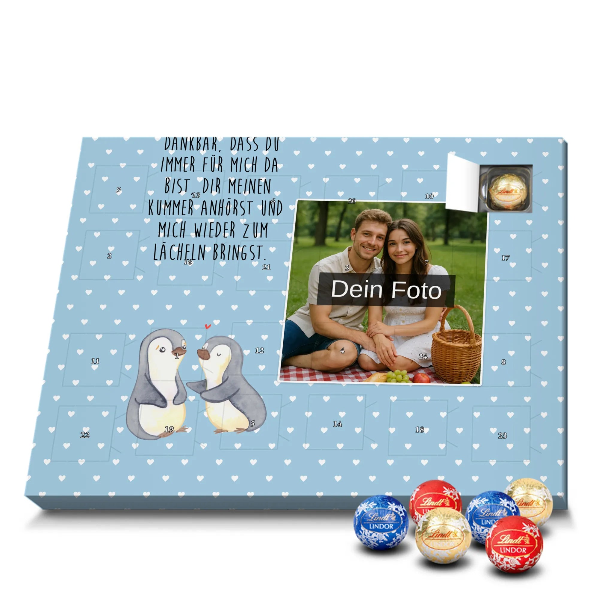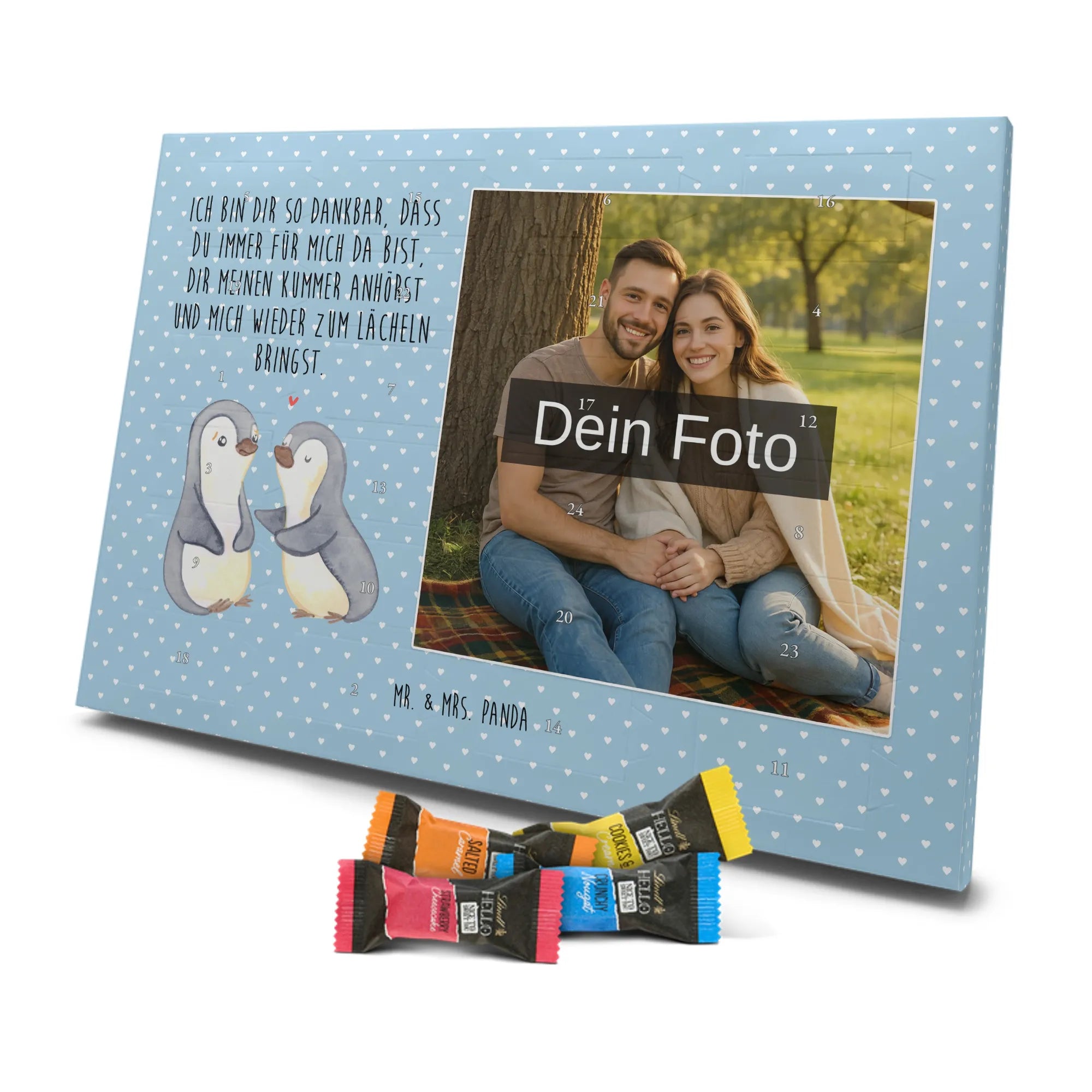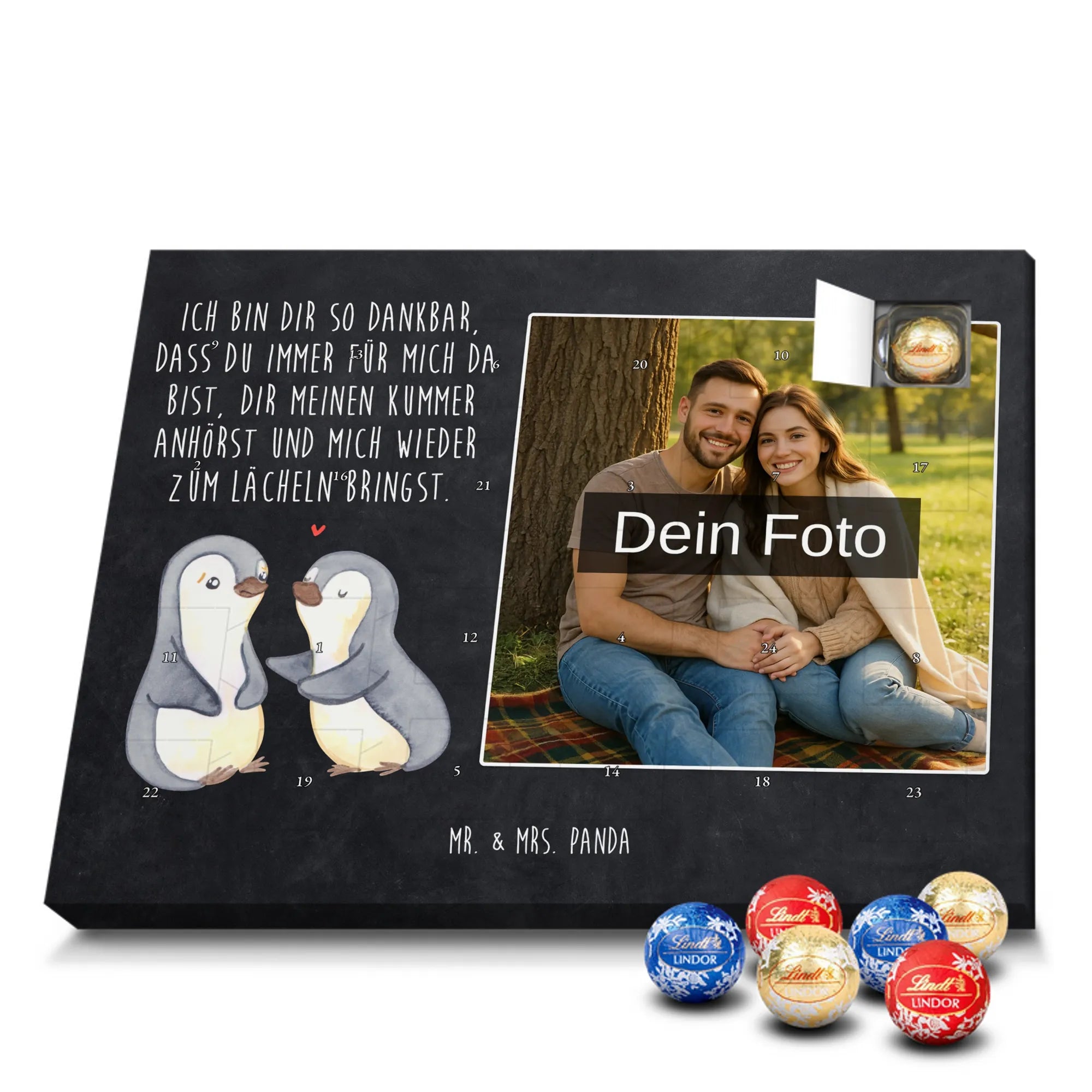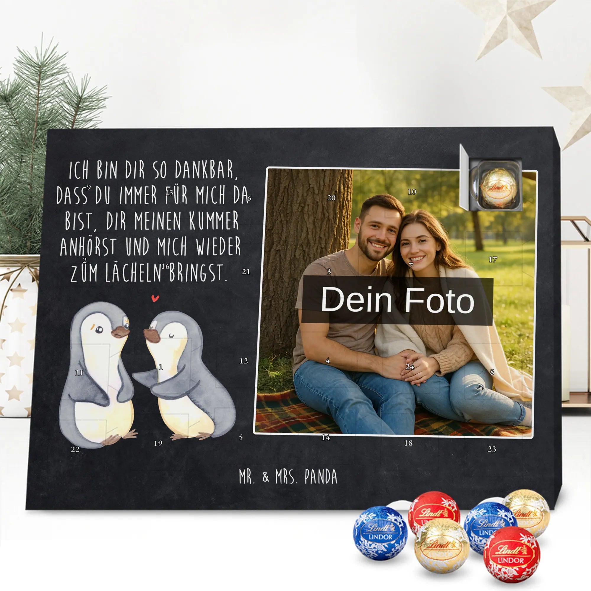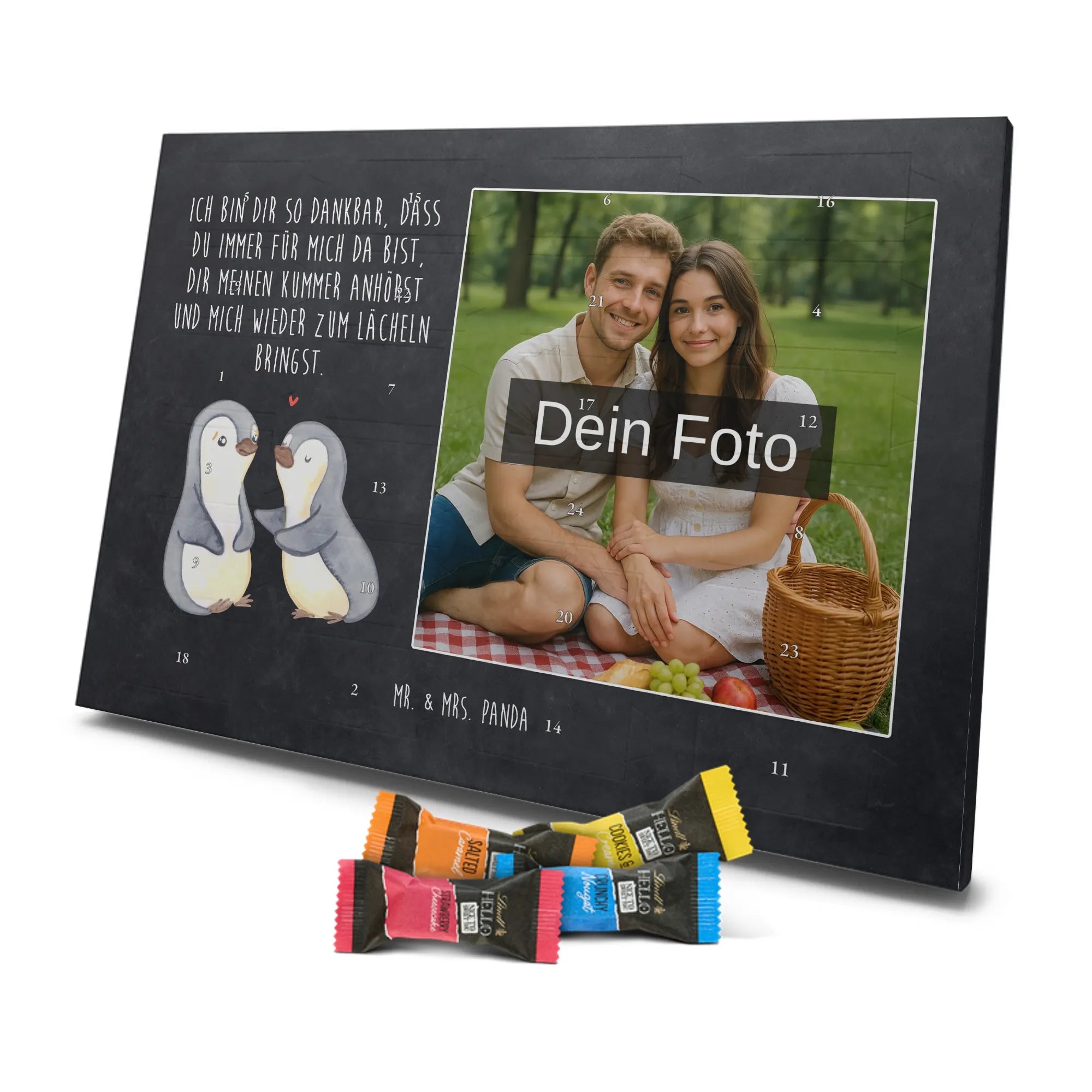 Wunderschöner Personalisierter Schoko Foto Adventskalender von Mr. & Mrs. Panda – perfekt zum Verschenken oder zum Verwöhnen. Dieser Adventskalender verbindet liebevolle Mr. & Mrs. Panda-Motive und Sprüche mit deinem persönlichen Foto auf der Vorderseite. Die hochwertige Verarbeitung mit seidenmatter Oberflächenveredelung sorgt für brillante Farben und eine edle Haptik, die man gerne anfasst. Bedruckte Seitenflächen und die stabile Ausführung machen den Kalender zum echten Hingucker in der Adventszeit. Bitte achte auf eine hohe Auflösung deines Fotos, damit das Druckergebnis klar und scharf wird, und wähle einen passenden Bildausschnitt, damit keine wichtigen Details abgeschnitten werden. Lade nur Bilder hoch, bei denen du die Rechte besitzt oder die Erlaubnis hast, besonders bei Fotos mit Personen. Wichtig: Die Fotos werden weder aufbereitet noch zugeschnitten – eine Rücknahme bei personalisierten Foto-Artikeln ist ausgeschlossen. Der Kalender kann aufgehängt oder aufgestellt werden, so wie es dir gefällt. Maße: 233 mm x 178 mm x 24 mm. Gefüllt mit Lindt Lindor Markenschokolade: 24 einzeln verpackte Markenschokoladen Kugeln in drei Sorten (Vollmilch, Feinherb, Weiße Schokolade). Zutatenhinweis: Kann Haselnüsse und Mandeln enthalten. Ein liebevoller, personalisierter Adventsmoment von Mr. & Mrs. Panda.