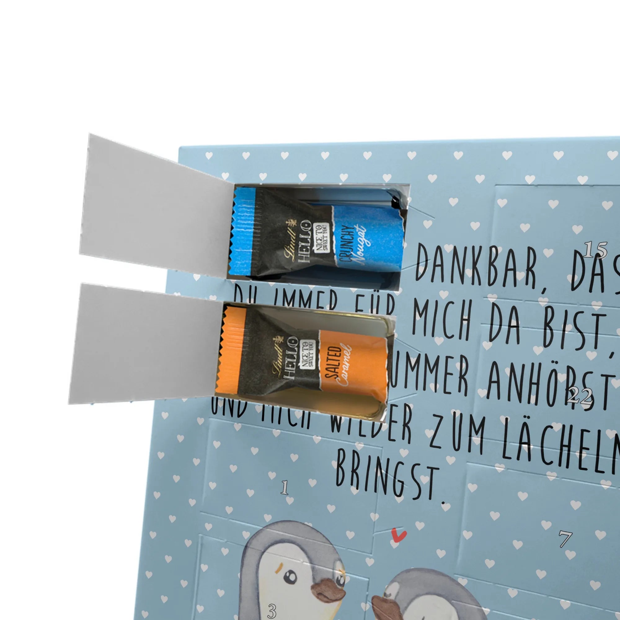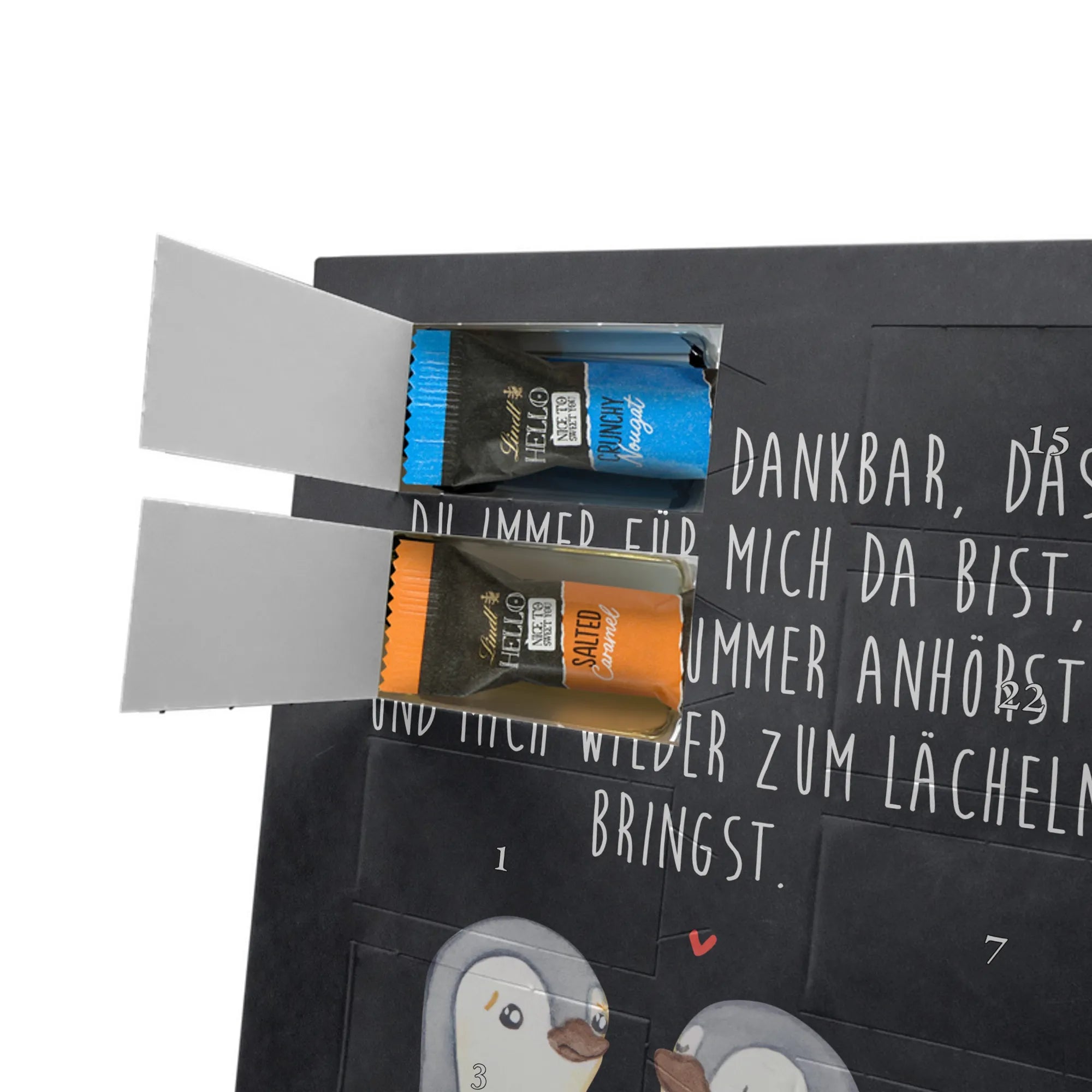 Verschenke Vorfreude: Unser individueller Foto-Adventskalender mit Schokolade von Mr. & Mrs. Panda macht jeden Dezembertag zum kleinen Fest. Der Kalender kombiniert bezaubernde Illustrationen und Sprüche von Mr. & Mrs. Panda mit deinem eigenen Foto – so entsteht ein ganz persönliches Geschenk. Achte auf Bildqualität und Bildausschnitt, damit das Foto optimal zur Geltung kommt, und nutze nur Bilder, für die du die Rechte besitzt. Die hochwertige seidenmatte Oberfläche mit bedruckten Seitenflächen veredelt das Design. Maße: 325 mm x 225 mm x 27 mm. Gefüllt mit Lindt Hello Schokolade: 24 einzeln verpackte Mini Sticks in den Sorten Karamell-Schokoladenkuchen, Kekse, Knuspriger Nougat und Erdbeer-Cheesecake. Zutaten und Allergene findest du auf der Verpackung; enthalten sind z. B. Milcheiweiß, Milchzucker, Soja, Weizen und Haselnüsse. Besonderheit: Du kannst den Kalender aufstellen oder an der Wand aufhängen. Bitte beachten: Die Fotos werden weder aufbereitet noch zugeschnitten – personalisierte Foto-Artikel sind vom Rückgaberecht ausgeschlossen. Hol dir ein Stück Adventszauber mit deinem persönlichen Foto-Adventskalender!