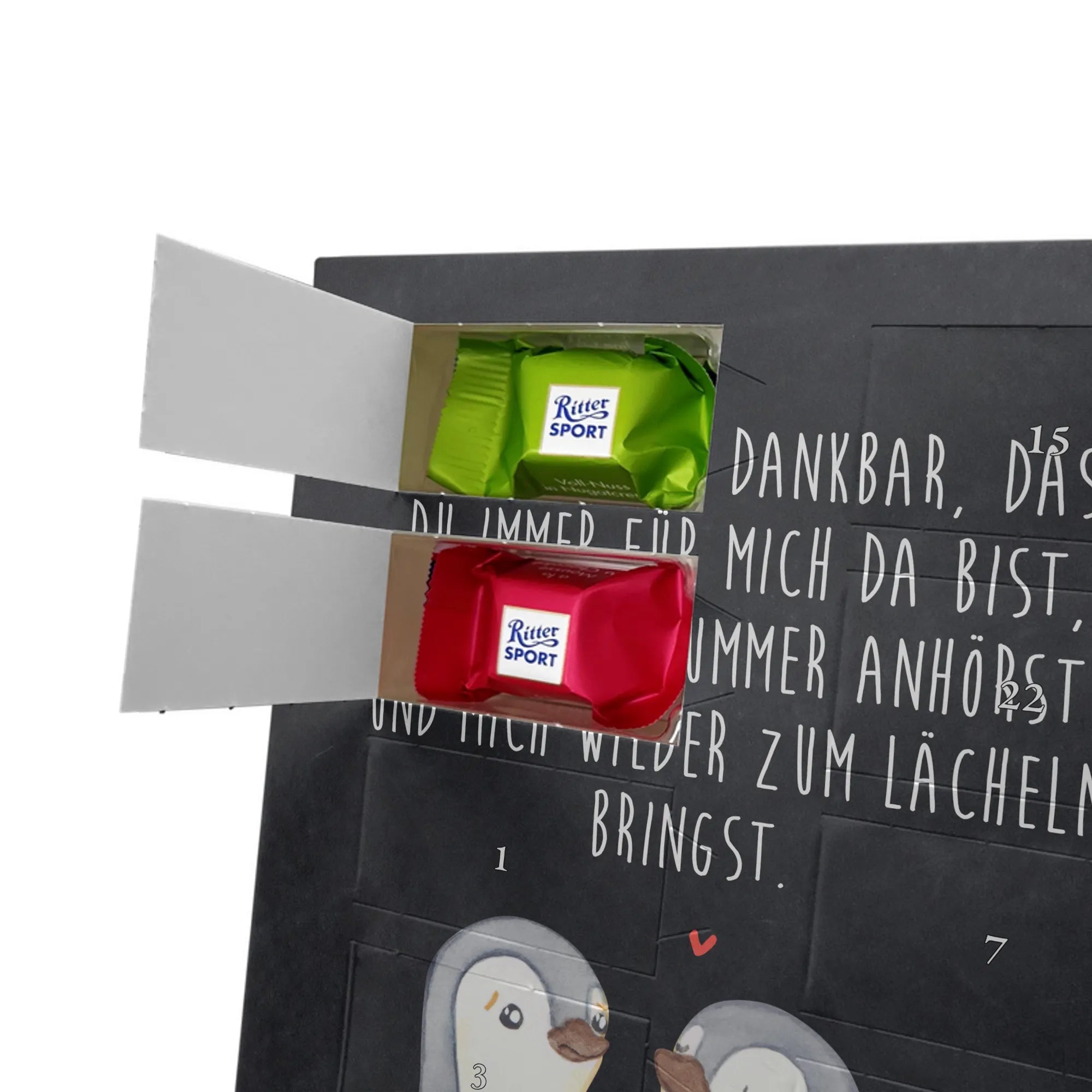 Wunderschöner Personalisierter Schoko Foto Adventskalender von Mr. & Mrs. Panda – das perfekte Geschenk für deine Liebsten! Dieser Adventskalender ist liebevoll gestaltet, bedruckt mit wunderschönen Motiven & Sprüchen von Mr. & Mrs. Panda und personalisierbar mit einem Foto deiner Wahl. Achte bitte auf hohe Auflösung: Lade ein Foto in guter Qualität und ausreichender Auflösung hoch, damit das Druckergebnis klar und brillant wird. Achte auf den richtigen Bildausschnitt, damit keine wichtigen Details abgeschnitten werden. Wir empfehlen, den Kalender-Rahmen vorher anzusehen, um zu wissen, wie dein Foto platziert wird. Lade nur Bilder hoch, bei denen du die Bildrechte besitzt oder die Erlaubnis hast. Die Fotos werden weder aufbereitet noch zugeschnitten. Rücknahme bei personalisierten Foto Artikeln ist ausgeschlossen. Der Kalender besticht durch brillante Druckqualität mit seidenmatter Oberflächenveredelung und bedruckte Seitenflächen. Maße: 325 mm x 225 mm x 27 mm. Besonderheit: Kann aufgehängt oder aufgestellt werden – ganz wie du möchtest. Gefüllt ist der Kalender mit Ritter Sport Schokowürfeln in leckeren Geschmacksrichtungen: Mousse au Chocolat, Schoko Crisp, Voll-Nuss in Nougatcreme, Karamell Duo, Joghurt und Erdbeer-Joghurt. Ein zauberhaftes, persönliches Geschenk, das Vorfreude bereitet und jeden Tag im Advent versüßt!
