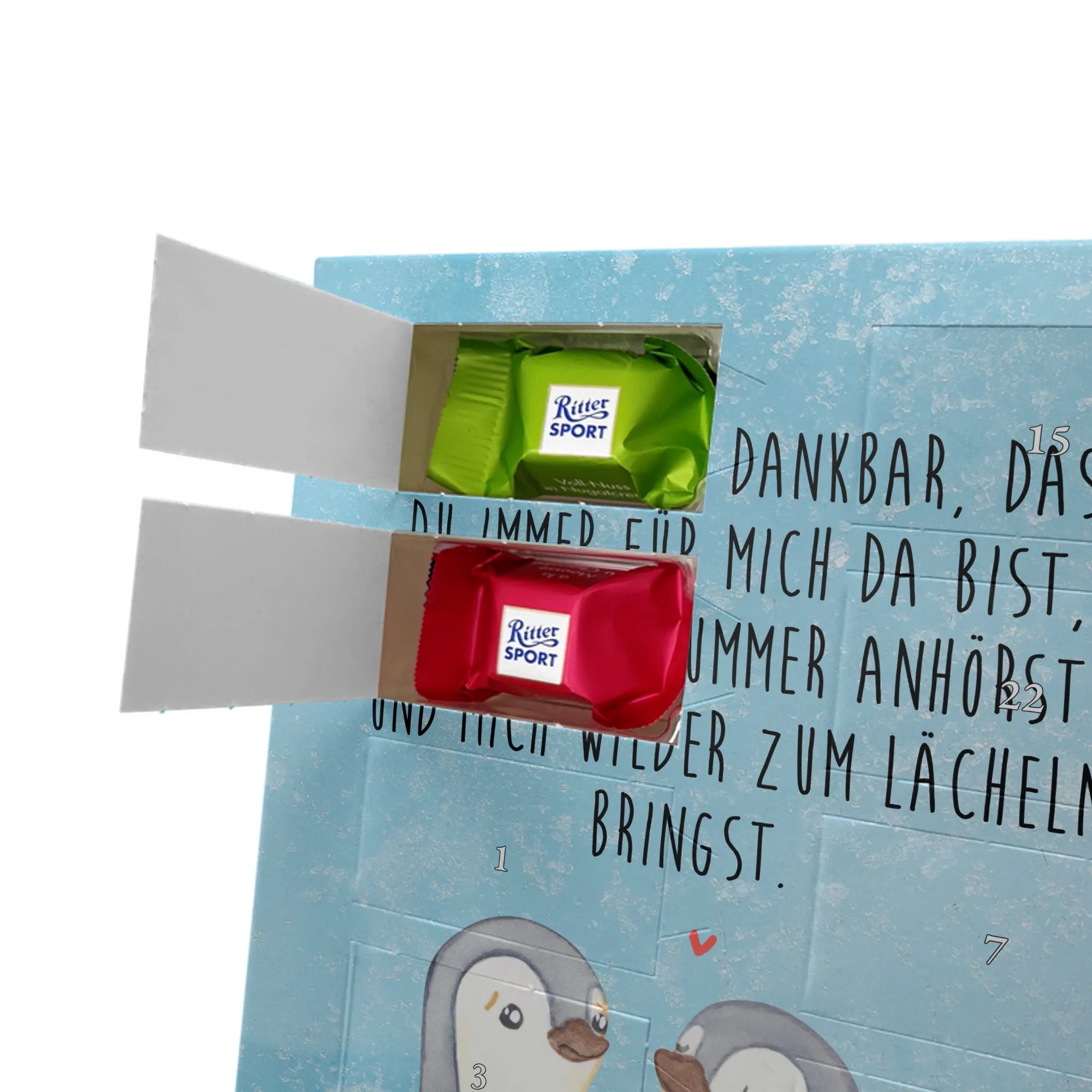 Schoko Foto Adventskalender personalisiert – ein fröhlicher Hingucker von Mr. & Mrs. Panda, der Adventszeit und Erinnerungen verbindet. Der Kalender ist bedruckt mit zauberhaften Motiven & Sprüchen von Mr. & Mrs. Panda und lässt sich ganz leicht mit einem Foto deiner Wahl personalisieren. Achtung Bildqualität: Für ein scharfes Druckbild solltest du ein Foto in hoher Auflösung verwenden. Kontrolliere den Bildausschnitt, damit wichtige Gesichter oder Details nicht verloren gehen. Verwende nur Fotos, für die du die Rechte besitzt oder die frei nutzbar sind. Bitte beachte: Die Fotos werden weder nachbearbeitet noch zugeschnitten und personalisierte Foto Artikel sind vom Umtausch ausgeschlossen. Die Verarbeitung überzeugt mit seidenmatter Oberflächenveredelung und bedruckten Seitenflächen für ein edles Finish. Maße: 325 mm x 225 mm x 27 mm. Besonderheit: Du kannst den Kalender aufhängen oder aufstellen – ganz flexibel. Gefüllt ist der Kalender mit Ritter Sport Schokowürfeln in leckeren Geschmacksrichtungen wie Mousse au Chocolat, Schoko Crisp, Voll-Nuss in Nougatcreme, Karamell Duo, Joghurt und Erdbeer-Joghurt. Ein liebevolles Geschenk, das jeden Tag im Advent versüßt.