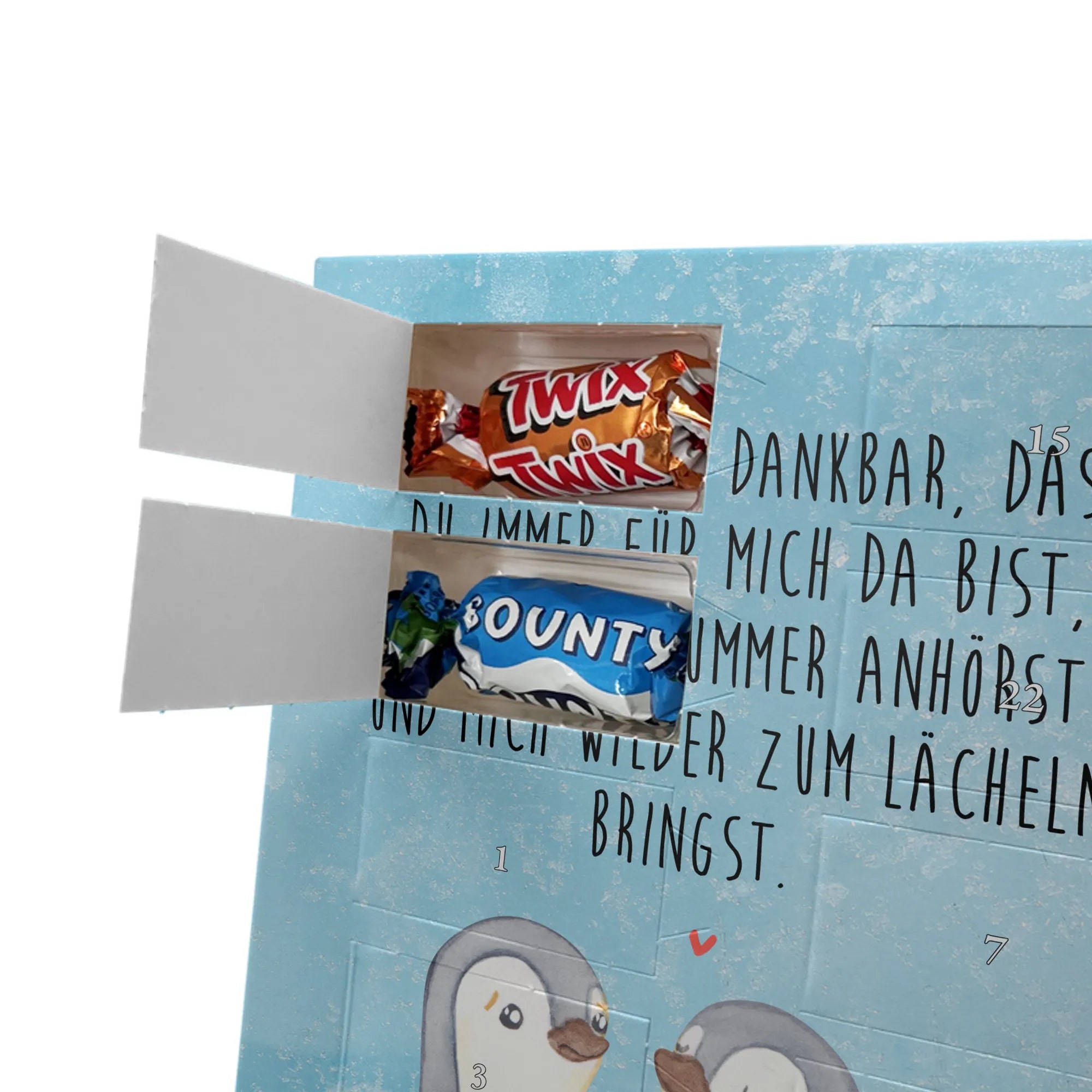 Herziger Personalisierter Foto Adventskalender mit Schokolade von Mr. & Mrs. Panda – perfekt, um schöne Erinnerungen sichtbar zu machen und jeden Dezembertag zu versüßen. Die Vorderseite ziert dein persönliches Foto, der Rest des Kalenders ist mit warmen Motiven und liebevollen Sprüchen von Mr. & Mrs. Panda gestaltet. Bitte lade ein Bild in hoher Auflösung hoch und prüfe den Bildausschnitt, damit nichts Wichtiges abgeschnitten wird. Verwende nur Fotos, bei denen du die Rechte besitzt oder die Zustimmung der abgebildeten Personen vorliegt. Unsere Drucke bestechen durch brillante Qualität und eine seidenmatte Oberflächenveredelung; auch die Seitenflächen sind bedruckt. Maße: 325 mm x 225 mm x 27 mm. Der Adventskalender lässt sich aufhängen oder aufstellen – ganz flexibel. Wichtiger Hinweis: Fotos werden nicht nachbearbeitet oder zugeschnitten; personalisierte Foto-Artikel sind vom Widerruf ausgeschlossen. Gefüllt ist der Kalender mit Celebrations Schokolade – 24 hochwertige Füllungen in 8 leckeren Sorten (Maltesers, Mars, Snickers, Twix, Milky Way, Bounty, Galaxy, Galaxy Caramel). Schenke ein persönliches Unikat, das Freude und Süße verbindet.