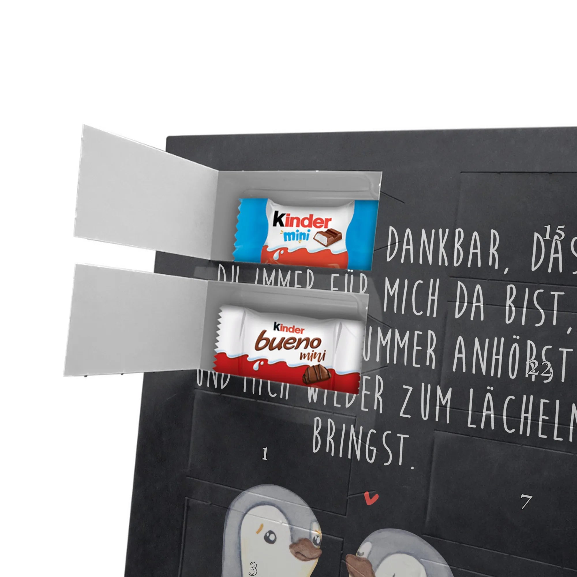 Personalisierter Foto Adventskalender mit Schokolade von Mr. & Mrs. Panda – das ideale Geschenk für alle, die persönliche Erinnerungen und süße Kleinigkeiten lieben. Lade dein Lieblingsbild hoch und wir drucken es auf die Vorderseite, flankiert von charmanten Illustrationen und Sprüchen unserer Panda-Crew. Bitte achte darauf, dass dein Bild eine hohe Auflösung hat und der Bildausschnitt sorgfältig gewählt ist, damit Gesichter und Details perfekt zur Geltung kommen. Nur Bilder mit entsprechenden Nutzungsrechten verwenden. Achtung: Wir nehmen keine Nachbearbeitung oder Zuschnitt der Fotos vor; personalisierte Fotoartikel sind vom Widerruf ausgenommen. Der Kalender überzeugt durch brillante Druckqualität, seidenmatte Oberflächenveredelung und bedruckte Seitenflächen. Maße: 355 mm x 245 mm x 11 mm. Du kannst ihn aufhängen oder aufstellen – so passt er in jede Adventsdekoration. Gefüllt mit kinder® Schokolade, darunter kinder® Schoko-Bons, kinder® Bueno mini und kinder® Schokolade mini. Ein liebevoller, persönlicher Adventskalender, der jedes Türchen mit einem Hauch Mr. & Mrs. Panda Magie öffnet.