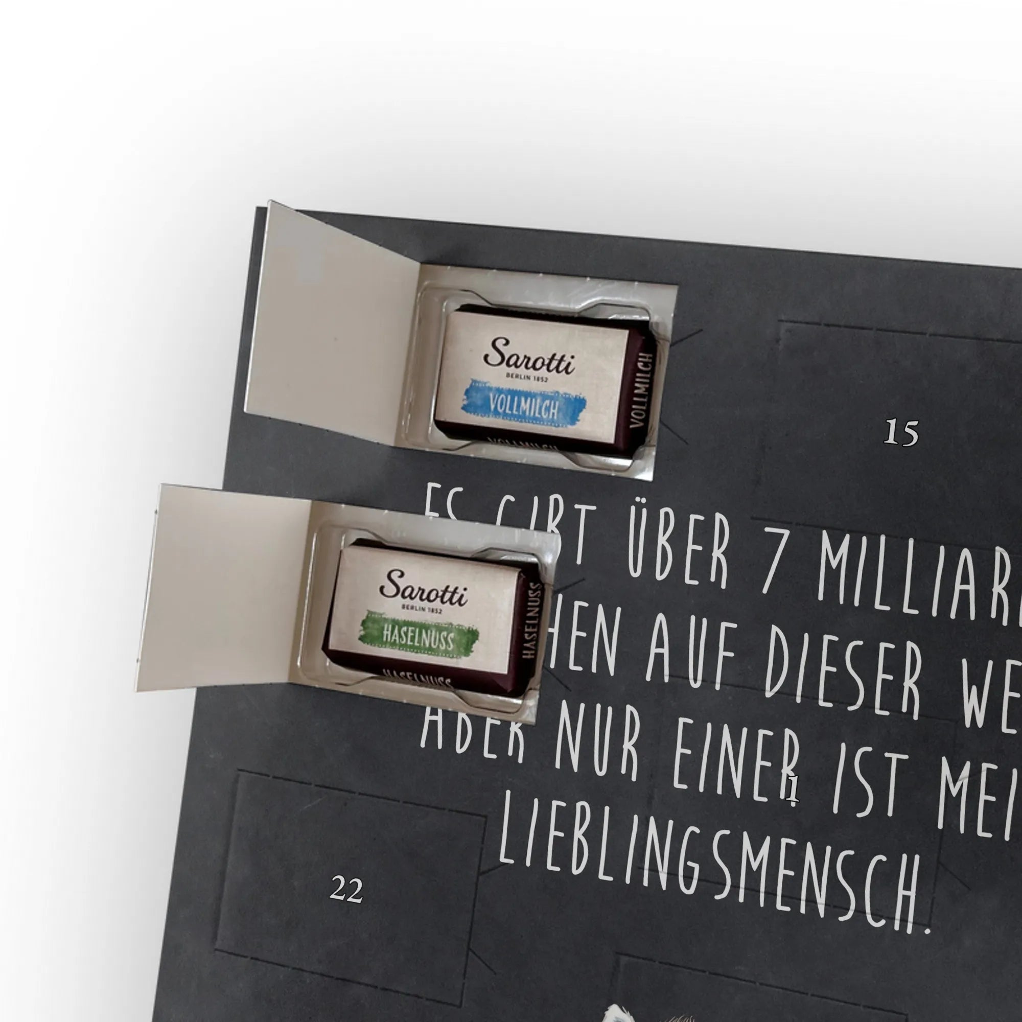 Personalisierter Schoko-Adventskalender mit Foto – das kleine Weihnachtswunder von Mr. & Mrs. Panda! Verschenke jeden Tag Vorfreude: Der Kalender ist liebevoll gestaltet mit unseren herzlichen Illustrationen und Sprüchen, während dein Foto die persönliche Mitte bildet. Bitte lade ein hochauflösendes Foto hoch und prüfe den Bildausschnitt, damit nichts Wichtiges verloren geht. Nutze nur Bilder, für die du die Rechte hast. Die hochwertige, seidenmatte Veredelung und die bedruckten Seitenflächen garantieren ein edles Erscheinungsbild. Maße: 355 mm x 245 mm x 11 mm; lässt sich sowohl aufhängen als auch aufstellen. Achtung: Fotos werden nicht nachbearbeitet oder zugeschnitten; personalisierte Artikel sind vom Rückgaberecht ausgeschlossen. Gefüllt mit 24 einzeln verpackten Schokoladentäfelchen aus den vier Geschmacksrichtungen Vollmilch, Nougat, Zartbitter und Haselnuss – von Sarotti® und Confiserie Heidel®. Insgesamt enthält der Kalender 107 g Markenschokolade. Ein persönliches Geschenk mit süßem Inhalt, ideal für Partner, Familie und Freunde, verpackt mit der typischen Mr. & Mrs. Panda Liebe zum Detail.