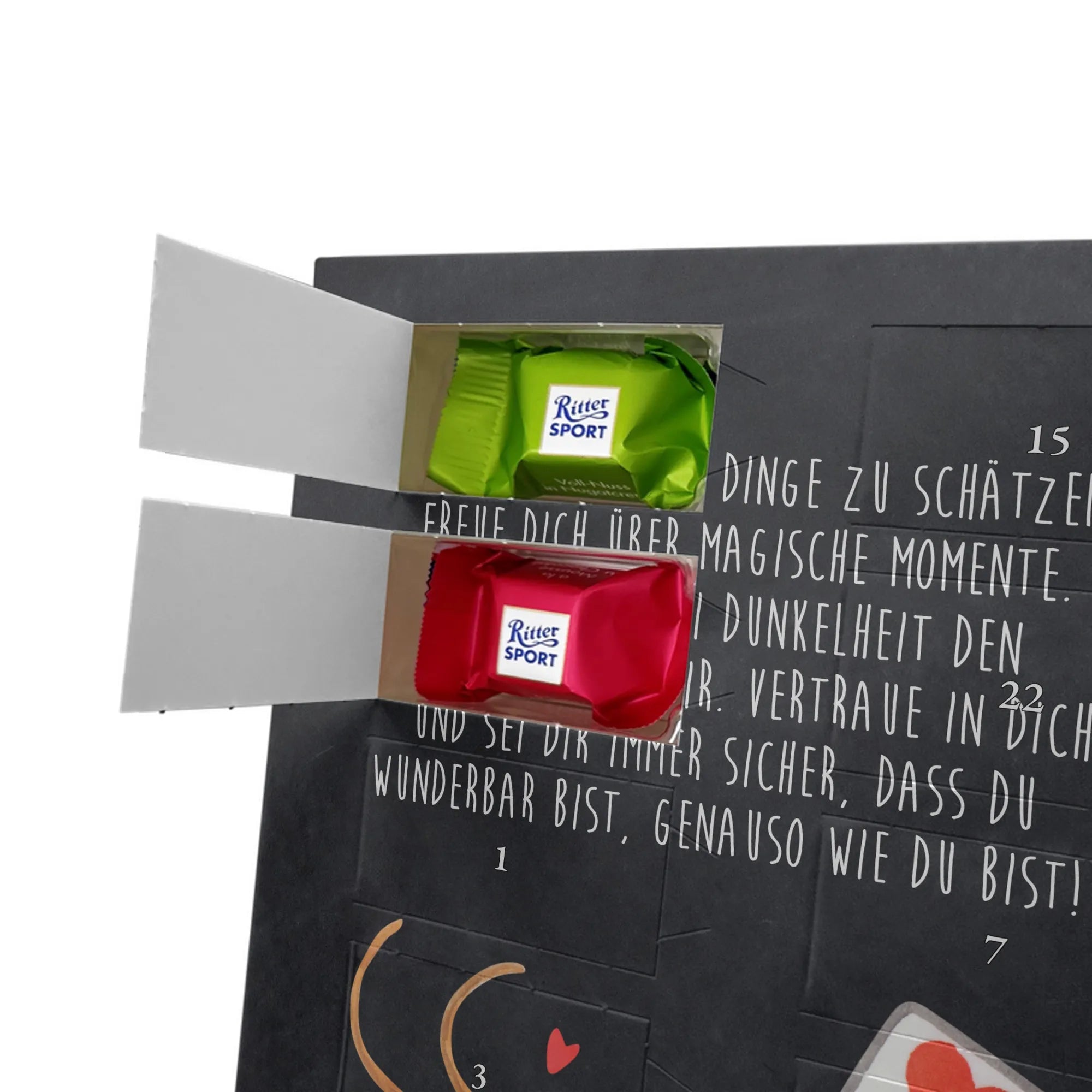 Personalisiertes Schoko-Foto Adventskalender von Mr. & Mrs. Panda – zaubere ein Lächeln in die Adventszeit mit einem persönlichen Foto und unseren liebevollen Motiven & Sprüchen. Der Kalender ist hochwertig bedruckt, verfügt über seidenmatte Oberflächenveredelung und bedruckte Seitenflächen für ein besonders schönes Erscheinungsbild. Bitte lade ein Foto in hoher Auflösung hoch und achte auf den richtigen Bildausschnitt, damit wichtige Details nicht verloren gehen. Verwende nur Bilder, bei denen du die Rechte besitzt; Fotos werden weder aufbereitet noch zugeschnitten und personalisierte Foto Artikel sind vom Umtausch ausgeschlossen. Maße: 325 mm x 225 mm x 27 mm. Besonderheit: Der Adventskalender kann aufgehängt oder aufgestellt werden – ganz flexibel. Gefüllt ist er mit Ritter Sport Schokowürfeln in köstlichen Geschmacksrichtungen wie Mousse au Chocolat, Schoko Crisp, Voll-Nuss in Nougatcreme, Karamell Duo, Joghurt und Erdbeer-Joghurt. Ein persönliches, süßes Geschenk, das hochwertige Optik mit täglichem Genuss verbindet und die Vorfreude auf Weihnachten jeden Tag steigert.