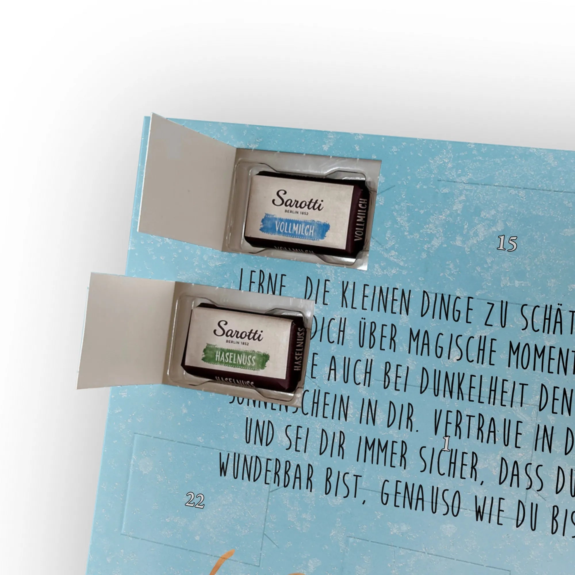 Schoko Foto Adventskalender personalisiert – ein zauberhaftes Geschenk, das Erinnerungen und Geschmack vereint. Mr. & Mrs. Panda haben liebevolle Motive und Sprüche gestaltet, die den Kalender umrahmen; dein Foto setzt die persönliche Note. Für ein optimales Druckbild lade bitte ein Foto mit hoher Auflösung hoch und achte auf einen passenden Bildausschnitt, damit wichtige Details nicht abgeschnitten werden. Bitte nur Bilder verwenden, für die du die Rechte besitzt. Die seidenmatte Oberflächenveredelung sorgt für edle Haptik und die bedruckten Seitenflächen für ein rundum gelungenes Design. Maße: 355 mm x 245 mm x 11 mm – kann aufgehängt oder aufgestellt werden. Wichtiger Hinweis: Wir bearbeiten oder schneiden die Fotos nicht nach; eine Rücknahme personalisierter Foto Artikel ist ausgeschlossen. Gefüllt mit 24 einzeln verpackten Schokoladentäfelchen in den Geschmacksrichtungen Vollmilch, Nougat, Zartbitter und Haselnuss von Sarotti® und Confiserie Heidel®. Insgesamt enthält der Kalender 107 g Markenschokolade. Ideal als Geschenk für Partner, Familie oder Freunde – persönlich, süß und liebevoll verpackt von Mr. & Mrs. Panda.