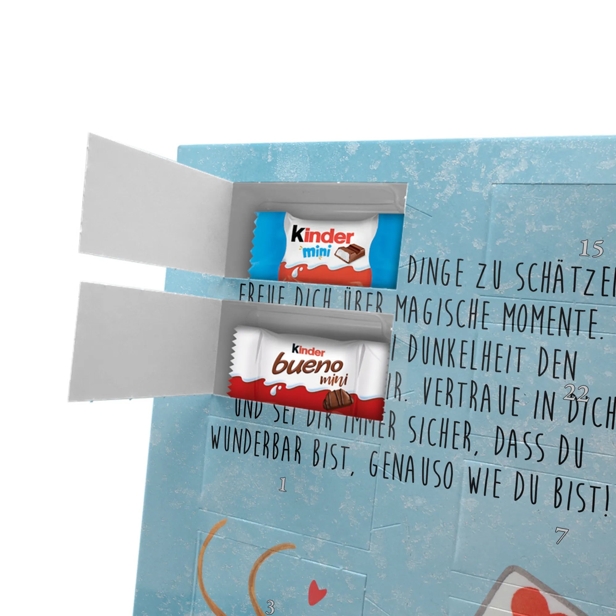 Unser personalisierten Schoko Foto Adventskalender ist ein echtes Highlight in der Adventszeit – handlich, individuell und voller süßer Überraschungen. Du personalisierst die Vorderseite mit deinem liebsten Foto und wir kombinieren es mit liebevollen Motiven und Sprüchen von Mr. & Mrs. Panda. Bitte achte auf eine ausreichende Bildauflösung und einen passenden Bildausschnitt, damit das Druckergebnis gestochen scharf ist. Lade nur Bilder hoch, deren Rechte du besitzt oder bei denen du die Erlaubnis hast, besonders wenn Personen darauf zu sehen sind. Wichtig: Fotos werden nicht retuschiert oder zugeschnitten; personalisierte Foto-Artikel sind vom Widerruf ausgeschlossen. Der Kalender besticht durch brillante Druckqualität und eine seidenmatte Oberflächenveredelung sowie bedruckte Seitenflächen. Maße: 355 mm x 245 mm x 11 mm. Du kannst ihn entweder aufstellen oder an die Wand hängen. Gefüllt ist der Adventskalender mit kinder® Schokolade, inklusive kinder® Schoko-Bons, kinder® Bueno mini und kinder® Schokolade mini. Ein liebevolles, persönliches Geschenk für Kinder, Freunde oder die bessere Hälfte – individuell, süß und mit dem typischen Mr. & Mrs. Panda Charme.