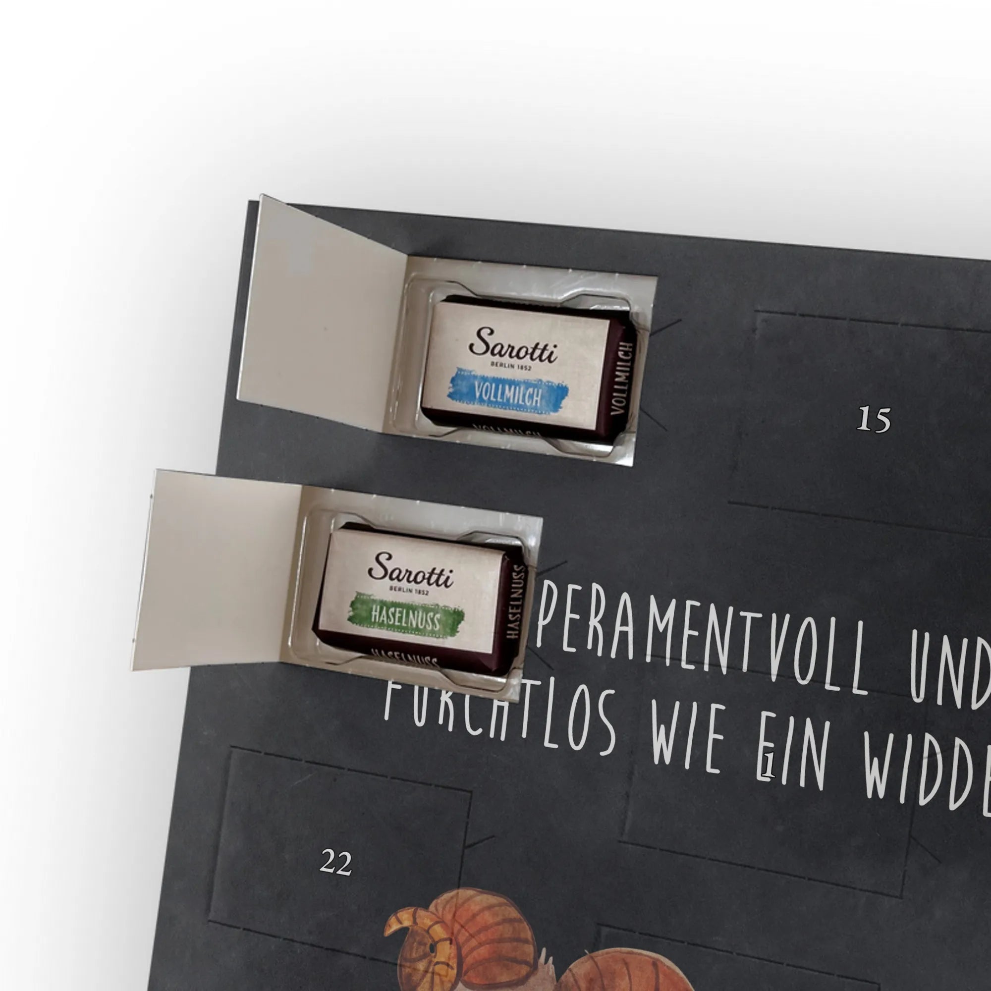 Wunderschöner Personalisierter Schoko Foto Adventskalender von Mr. & Mrs. Panda – das perfekte Geschenk für deine Liebsten! Dieser Adventskalender ist liebevoll gestaltet, bedruckt mit wunderschönen Motiven & Sprüchen von Mr. & Mrs. Panda und personalisierbar mit einem Foto deiner Wahl. Achte bitte auf hohe Auflösung: Lade ein Foto in guter Qualität und ausreichender Auflösung hoch, damit das Druckergebnis klar und brillant wird. Achte auf den richtigen Bildausschnitt, damit keine wichtigen Details abgeschnitten werden. Wir empfehlen, den Kalender-Rahmen vorher anzusehen, um zu wissen, wie dein Foto platziert wird. Lade nur Bilder hoch, bei denen du die Bildrechte besitzt oder die Erlaubnis hast. Die Fotos werden weder aufbereitet noch zugeschnitten. Rücknahme bei personalisierten Foto Artikeln ist ausgeschlossen. Der Kalender besticht durch brillante Druckqualität mit seidenmatter Oberflächenveredelung und bedruckte Seitenflächen. Maße: 325 mm x 225 mm x 27 mm. Besonderheit: Kann aufgehängt oder aufgestellt werden – ganz wie du möchtest. Gefüllt ist der Kalender mit Ritter Sport Schokowürfeln in leckeren Geschmacksrichtungen: Mousse au Chocolat, Schoko Crisp, Voll-Nuss in Nougatcreme, Karamell Duo, Joghurt und Erdbeer-Joghurt. Ein zauberhaftes, persönliches Geschenk, das Vorfreude bereitet und jeden Tag im Advent versüßt!
