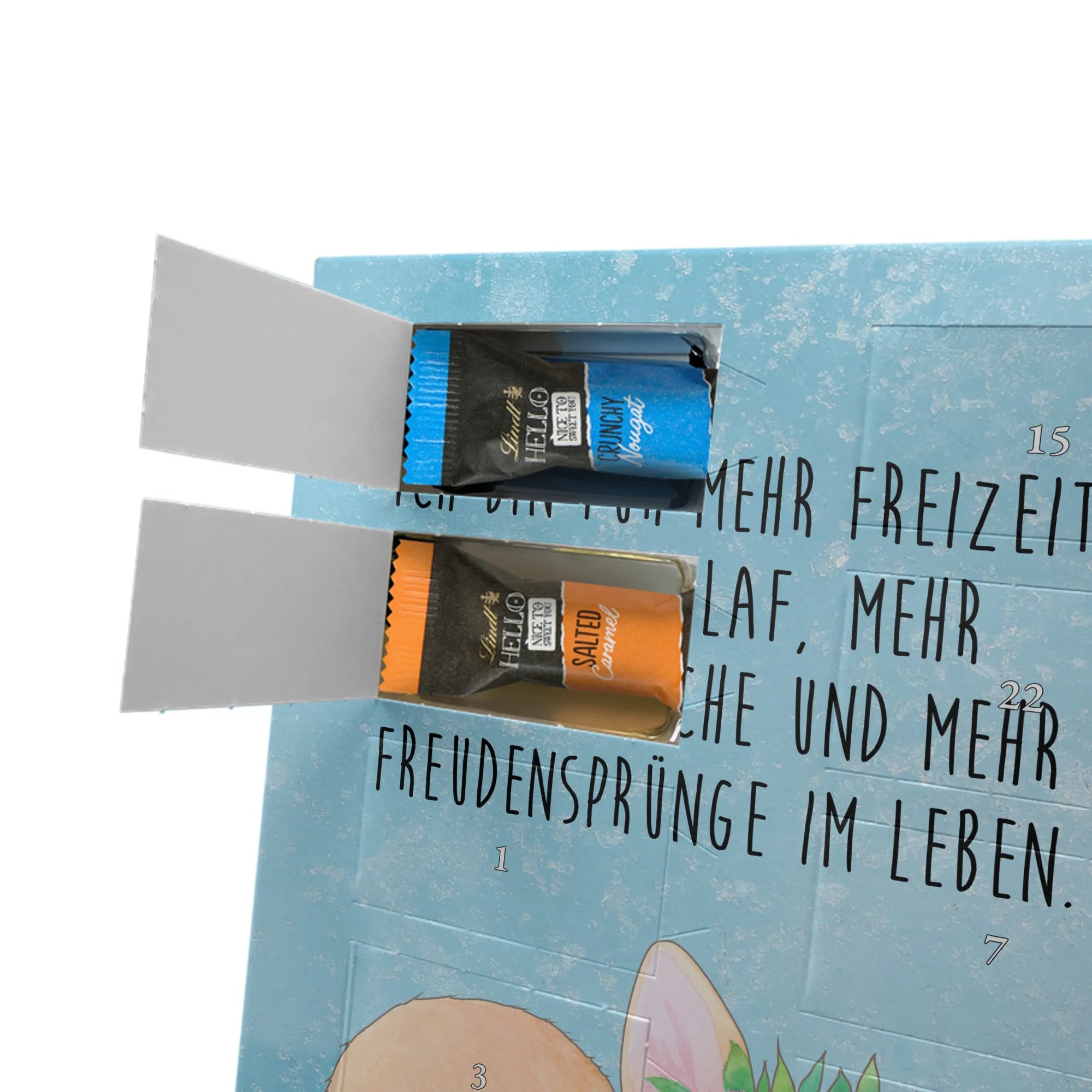 Mach die Adventszeit besonders persönlich mit unserem Foto Adventskalender mit Schokolade von Mr. & Mrs. Panda. Jeder Kalender ist mit niedlichen Motiven und herzlichen Sprüchen versehen, die perfekt zu einem individuellen Foto passen. Lade ein klares, hochauflösendes Bild hoch und überprüfe den Bildausschnitt, damit nichts Wichtiges abgeschnitten wird. Beachte bitte die Bildrechte – nur eigene Fotos oder solche mit Genehmigung verwenden. Die seidenmatte Oberflächenveredelung und der vollflächig bedruckte Look inklusive bedruckter Seitenflächen machen den Kalender zu einem Hingucker. Maße: 325 mm x 225 mm x 27 mm. Du erhältst 24 einzeln verpackte Schokoladen Mini Sticks in vier leckeren Geschmacksrichtungen: Karamell-Schokoladenkuchen, Kekse, Knuspriger Nougat und Erdbeer-Cheesecake. Gefüllt mit Lindt Hello Schokolade. Allergene: Milcheiweiß, Milchzucker, Soja, Weizen, Haselnüsse; kann Mandeln und weitere Schalenfrüchte enthalten. Besonderheit: Der Kalender kann aufgehängt oder aufgestellt werden. Hinweis: Fotos werden weder nachbearbeitet noch zugeschnitten – personalisierte Foto-Artikel sind vom Rückgaberecht ausgeschlossen. Verschenke süße Erinnerungen mit deinem eigenen Foto.