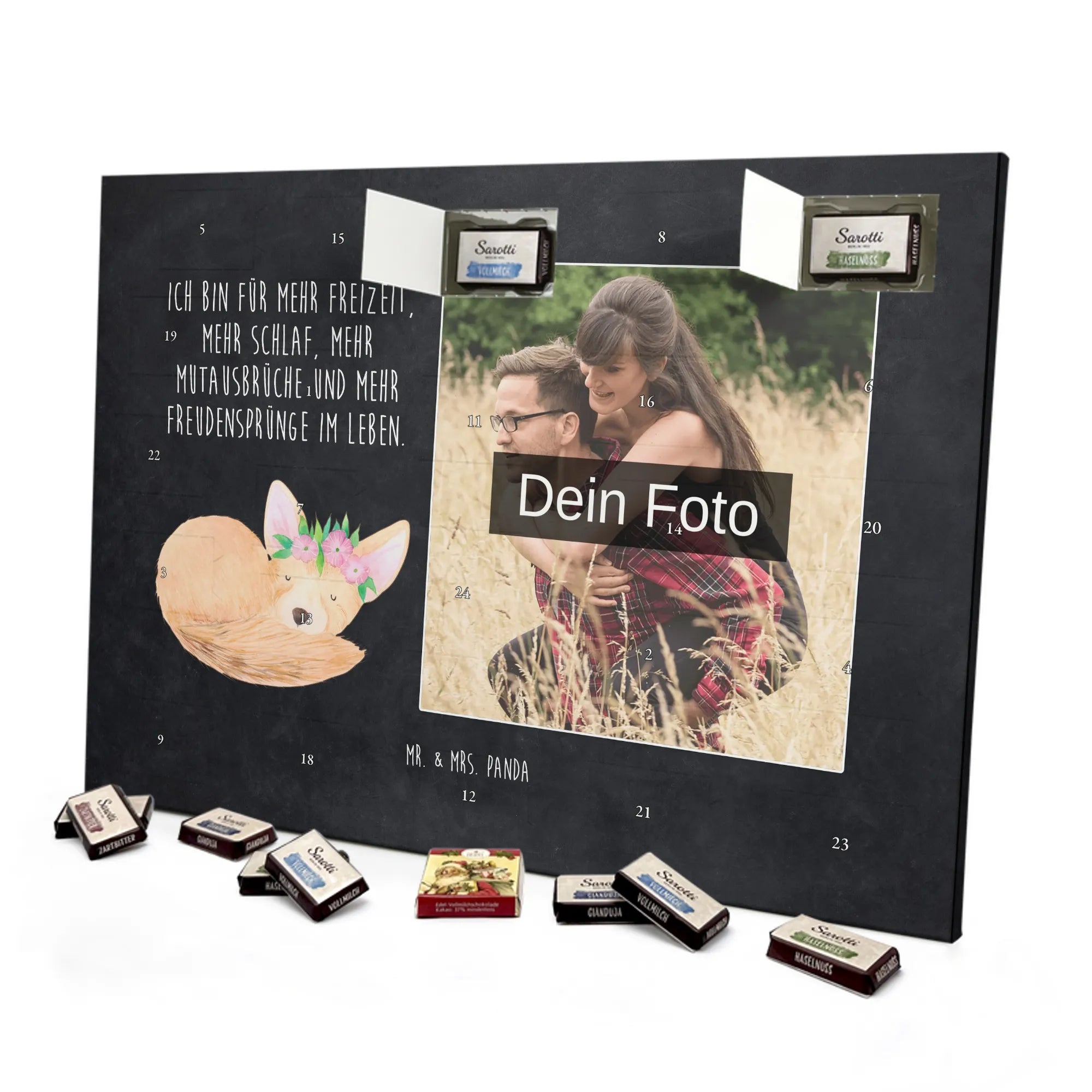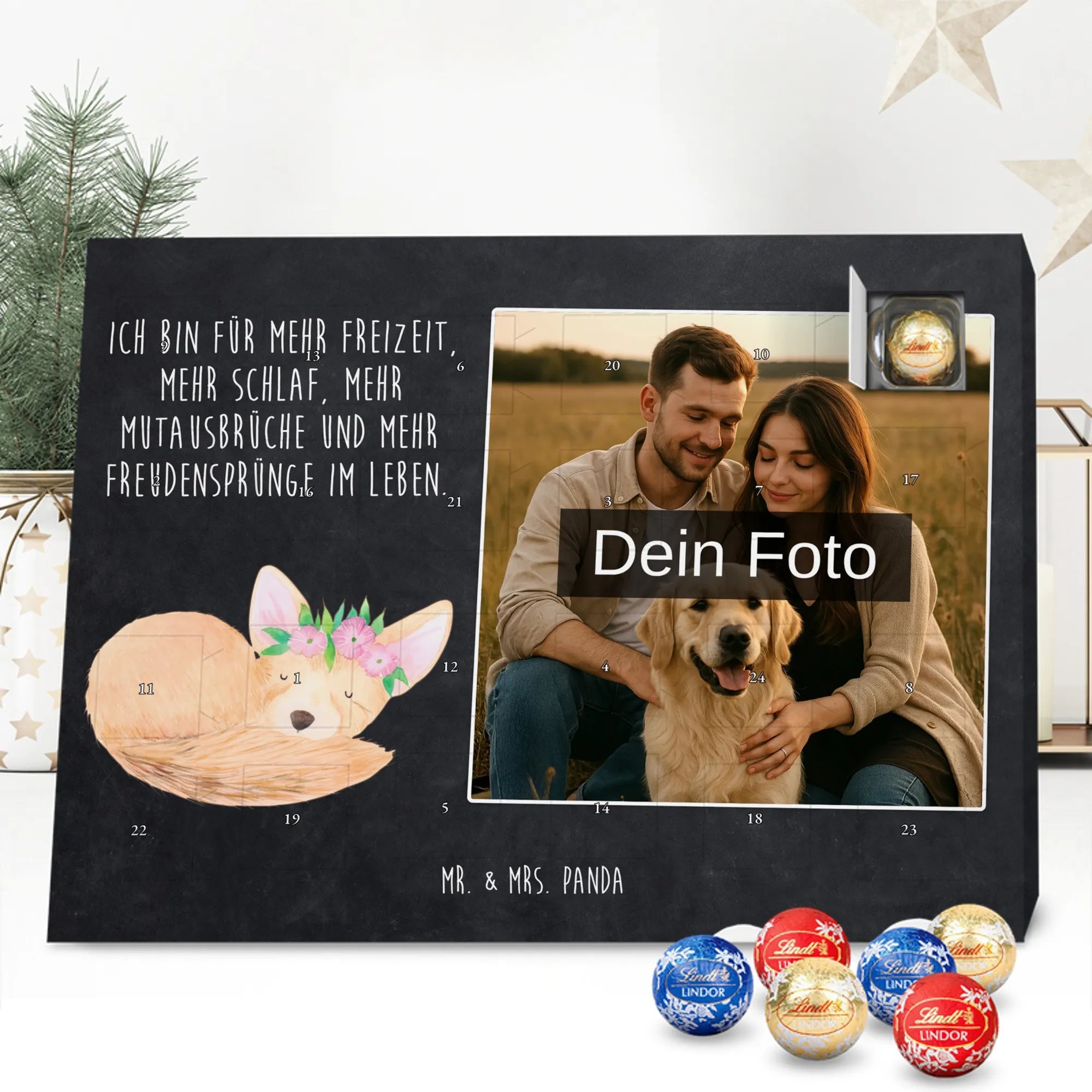 Mach die Adventszeit besonders: Verschenke Erinnerungen, Genuss und ein liebevolles Design mit dem personalisierten Schoko Foto Adventskalender Wüstenfuchs Blumenkranz von Mr. & Mrs. Panda.