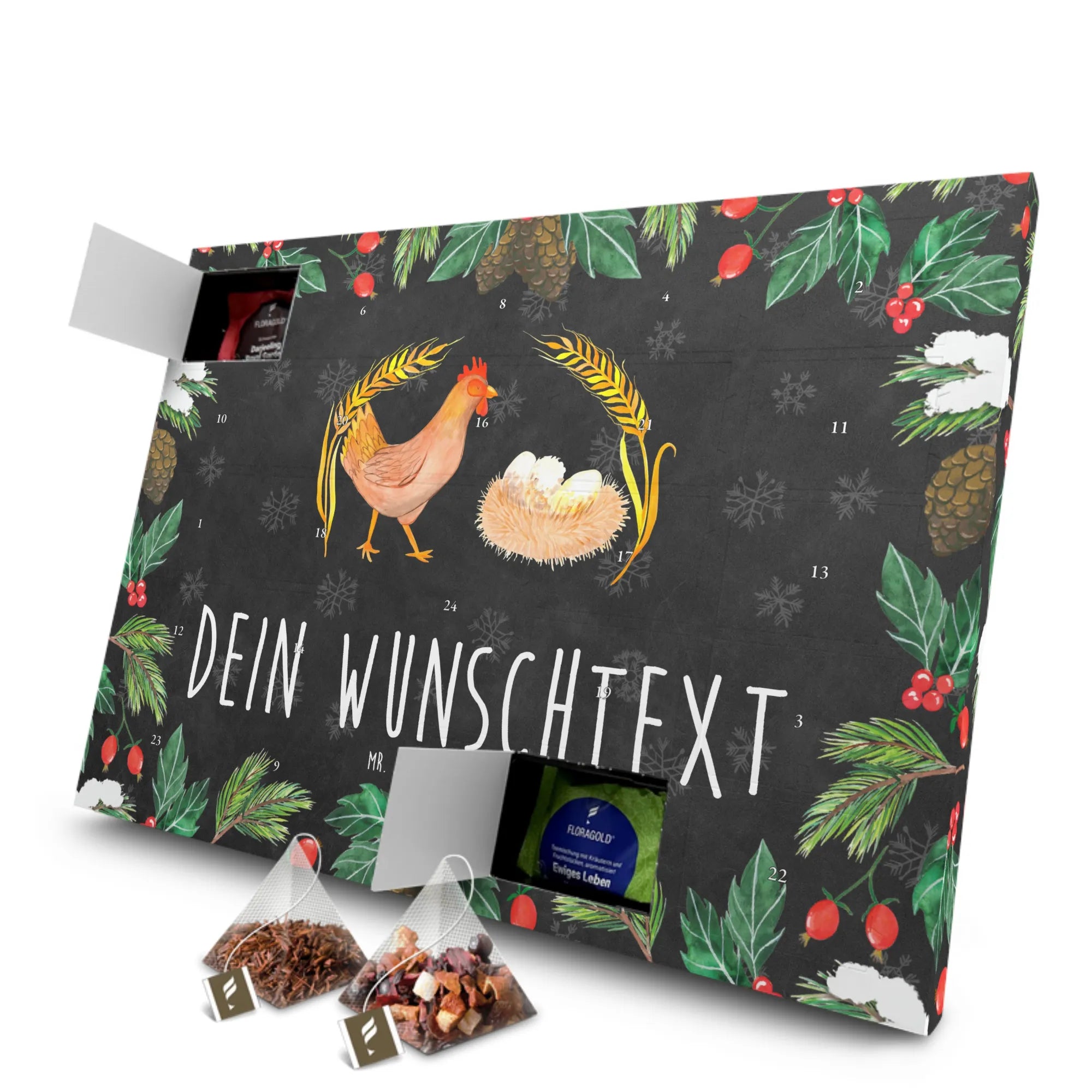 Der Personalisierte Tee Adventskalender "Huhn stolz" von Mr. & Mrs. Panda ist das perfekte Geschenk für alle Teeliebhaber und Freunde des Landlebens! Dieser wunderschöne Adventskalender bringt nicht nur eine Auswahl an köstlichen Teesorten, sondern auch eine liebevolle Botschaft mit sich, die das Herz erwärmt.