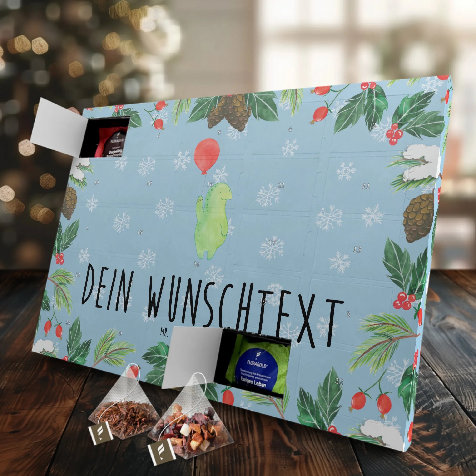 Bist du auf der Suche nach dem perfekten Geschenk für einen Tee-Liebhaber oder Schildkröten-Fan? Dann ist der personalisierte Tee Adventskalender "Schildkröte Luftballon" von Mr. & Mrs. Panda die ideale Wahl! Dieser wunderschöne Adventskalender verbindet die Vorfreude auf Weihnachten mit der Freude am Tee – und das in einem exquisiten Design. Die putzige Schildkröte schwebt an ihrem Luftballon und verbreitet schon beim ersten Blick gute Laune und Motivation. Mit dem Spruch "Mutausbruch statt Wutausbruch" bringt er außerdem eine Portion Inspiration mit in die Adventszeit.