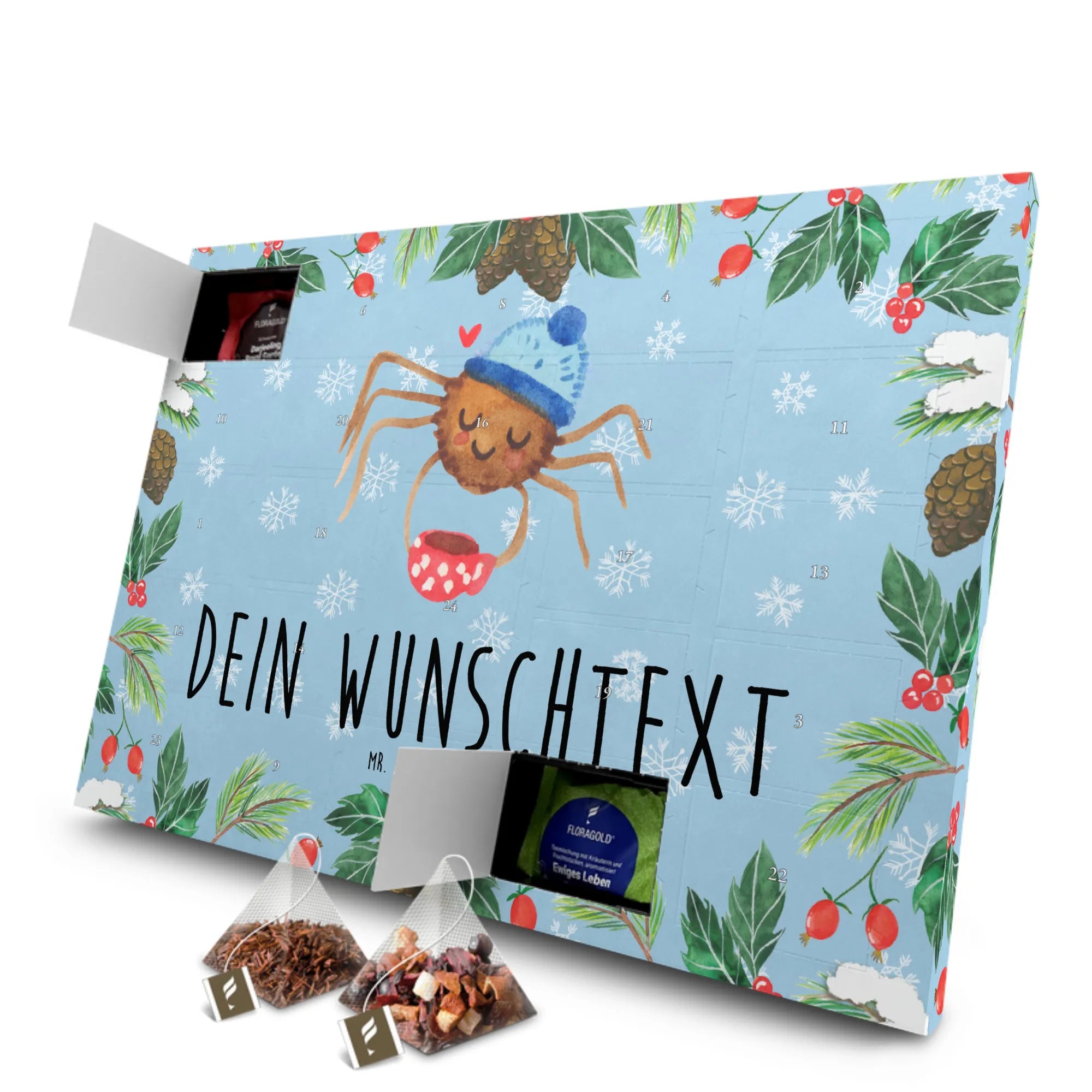 Bist du auf der Suche nach dem perfekten Geschenk für einen Teeliebhaber oder einen Morgenmuffel? Dann ist der personalisierte Tee Adventskalender Spinne Agathe Kaffee von Mr. & Mrs. Panda genau das Richtige!