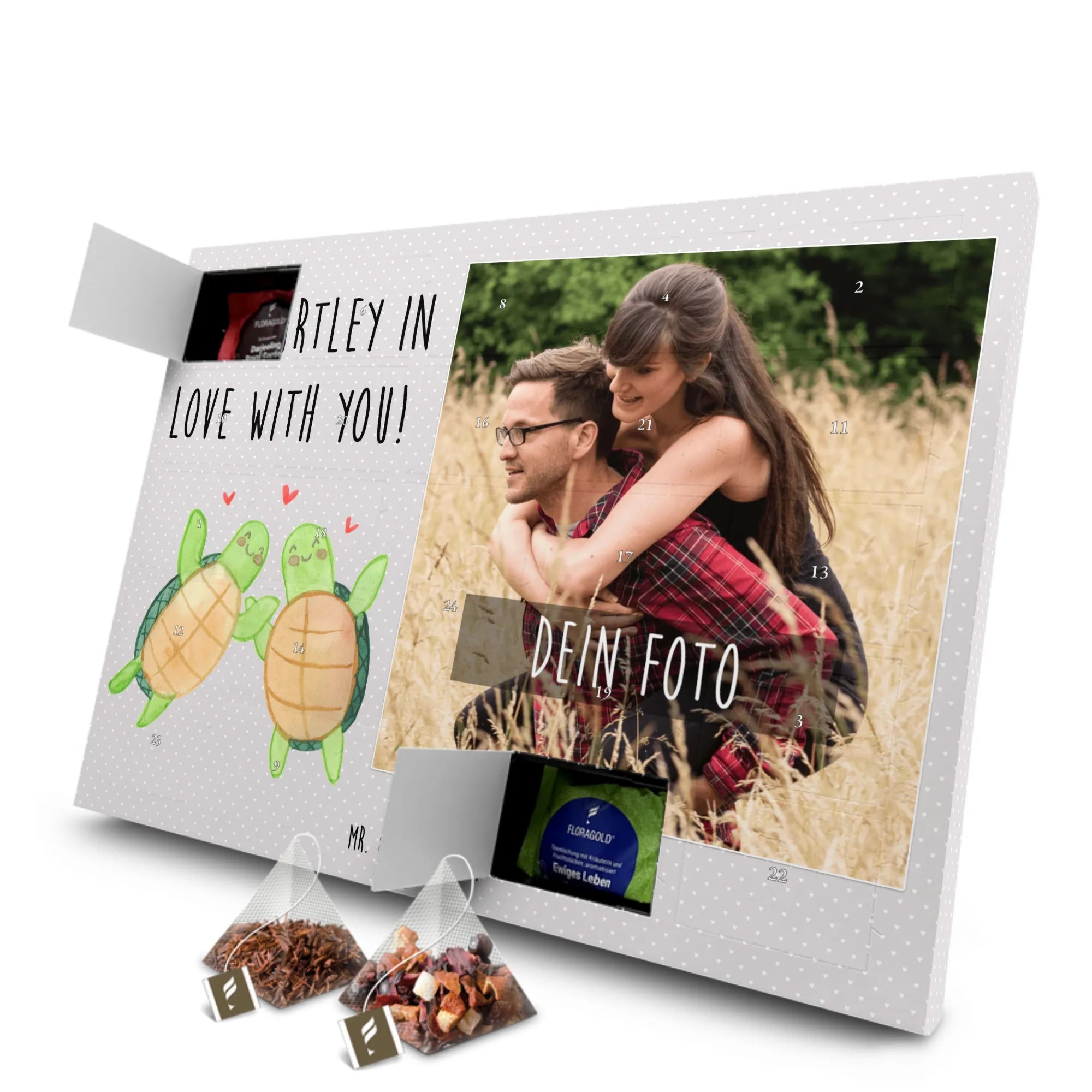 Der personalisierte Tee Foto Adventskalender von Mr. & Mrs. Panda ist das perfekte Geschenk für Verliebte und Tee-Liebhaber. Egal ob zum Valentinstag, Jahrestag oder einfach als liebevolles Mitbringsel – dieser einzigartige Adventskalender bringt Freude und Wärme in die kalte Jahreszeit. Mit einem wunderschönen Motiv, das zwei niedliche Schildkröten zeigt, die zueinandergewandt sind, symbolisiert er Liebe und Zusammengehörigkeit. Die kleinen roten Herzen zwischen den Schildkröten verleihen dem Design eine herzerwärmende Note.