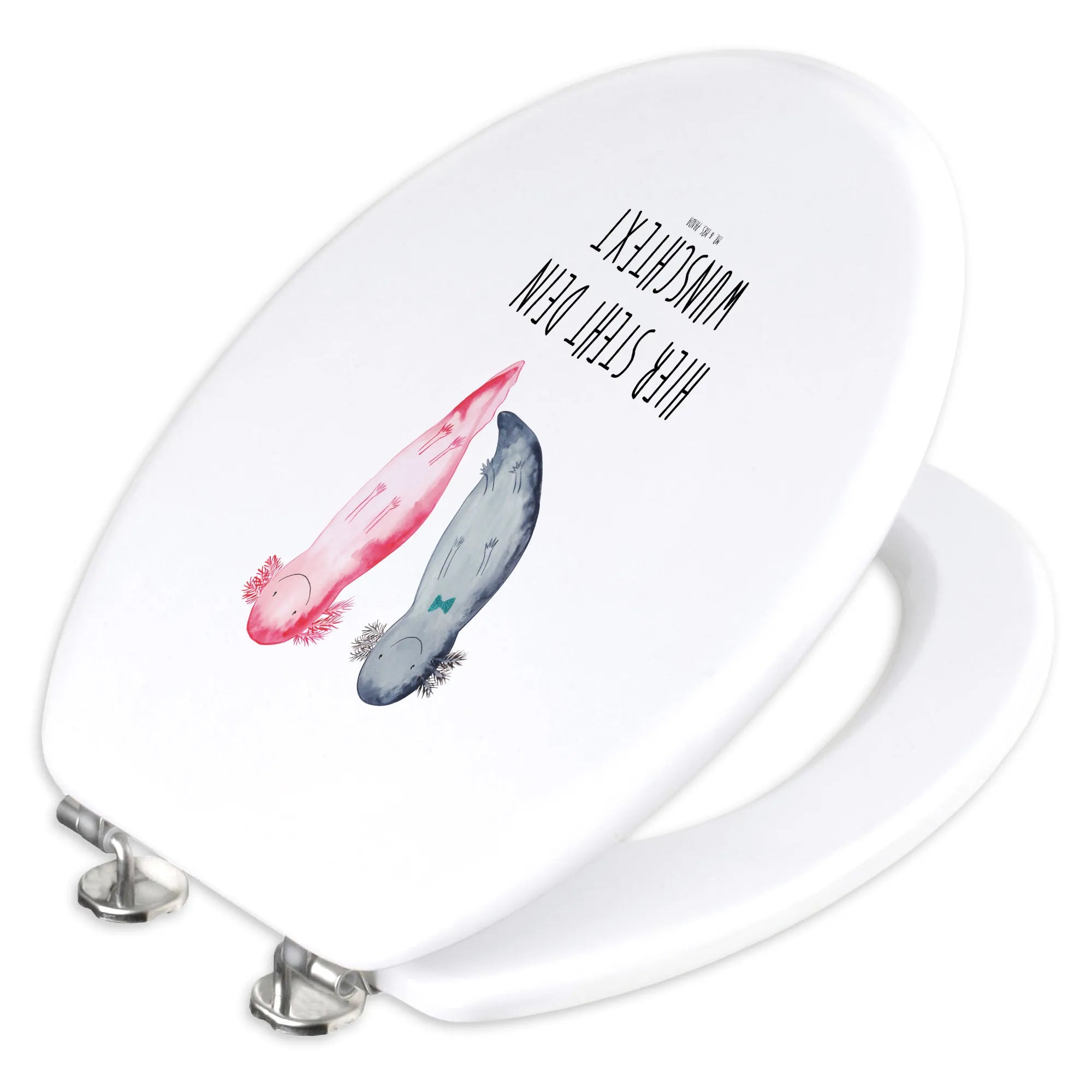 Du suchst das perfekte Geschenk für deine große Liebe oder einen besonderen Freund? Dann ist unser personalisierten WC Sitz mit dem zauberhaften Motiv Axolotl Axel+Lotte von Mr. & Mrs. Panda die ideale Wahl! Mit seinem einzigartigen Design bringt dieser Toilettendeckel nicht nur Farbe ins Badezimmer, sondern wird auch zu einem zauberhaften Liebesbeweis. Die beiden niedlichen Axolotl schwimmen anmutig Seite an Seite und versprühen Freude und Lebenslust!