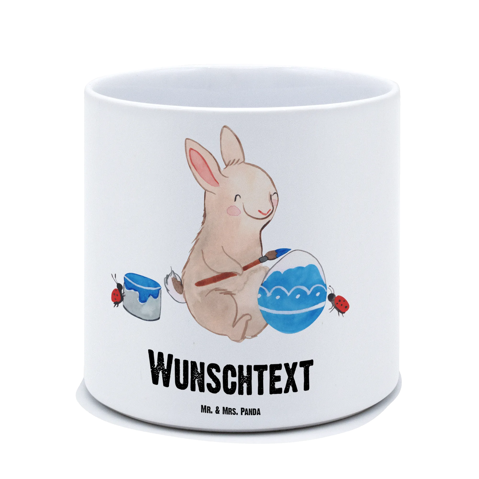 Der personalisierte XL Blumentopf Hase Marienkäfer von Mr. & Mrs. Panda ist das perfekte Geschenk für Ostern! Mit seinem bezaubernden Motiv eines kleinen Hasen, der fröhlich ein Osterei bemalt, bringt er das Osterfest direkt in dein Zuhause. Die niedlichen Marienkäfer unterstützen den Hasen, während er seine Kunstwerke kreiert.