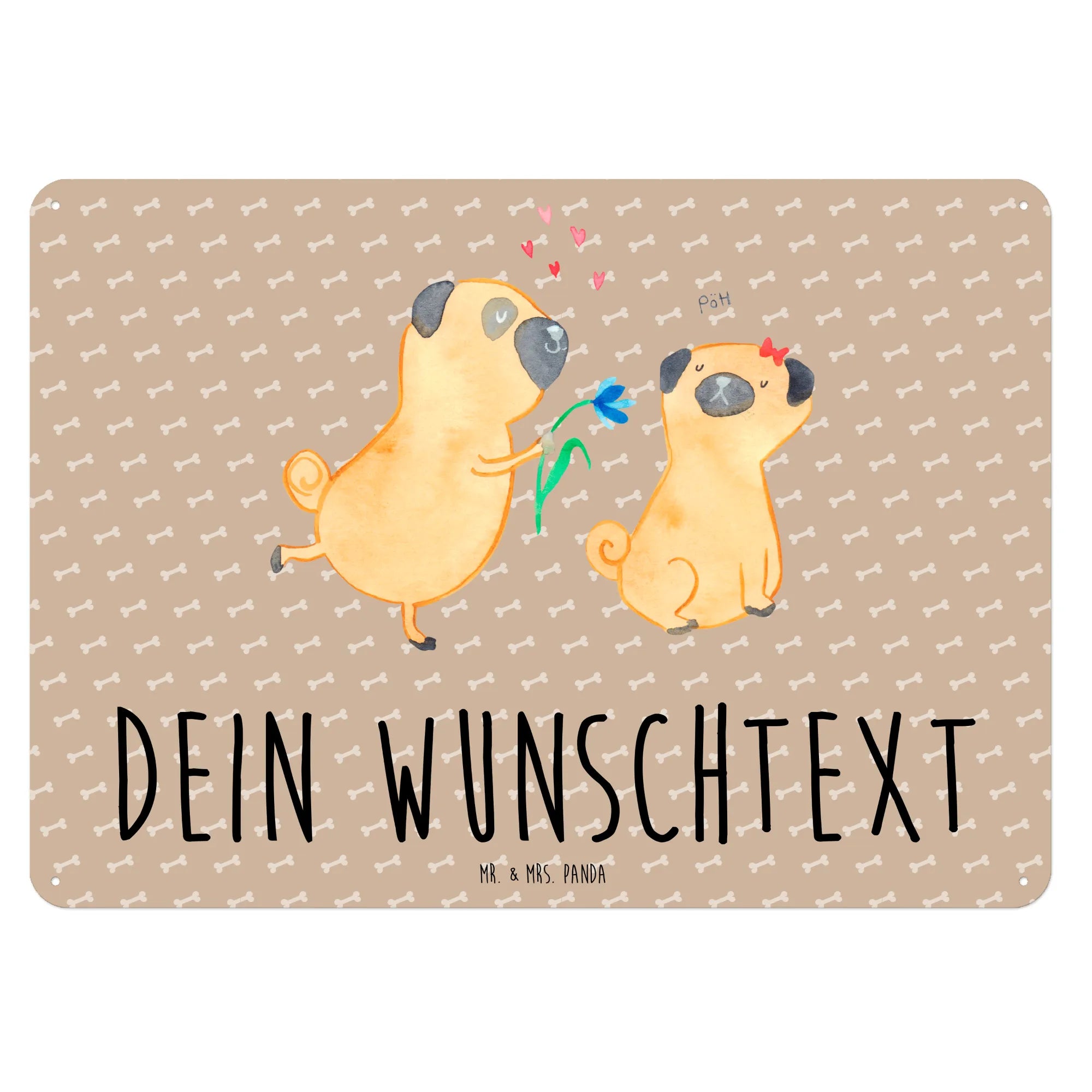 Ein wunderschönes und edles personalisiertes Blechschild von Mr. & Mrs. Panda, das mit Liebe und Leidenschaft für Hundeliebhaber gestaltet wurde. Das Schild zeigt zwei niedliche Möpse, die verliebt zusammen stehen, während einer dem anderen eine Blume reicht. Dies ist mehr als nur ein Schild – es ist ein Ausdruck von Hundeliebe und Zuneigung.