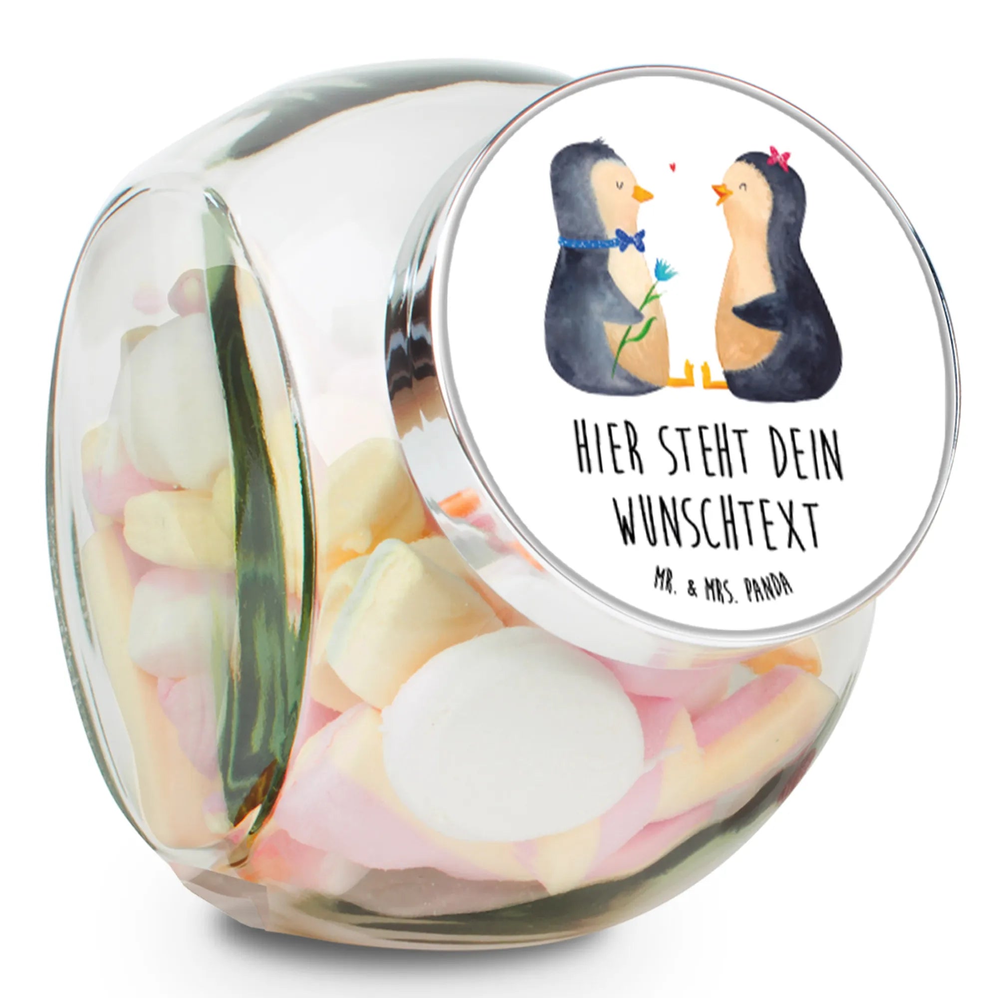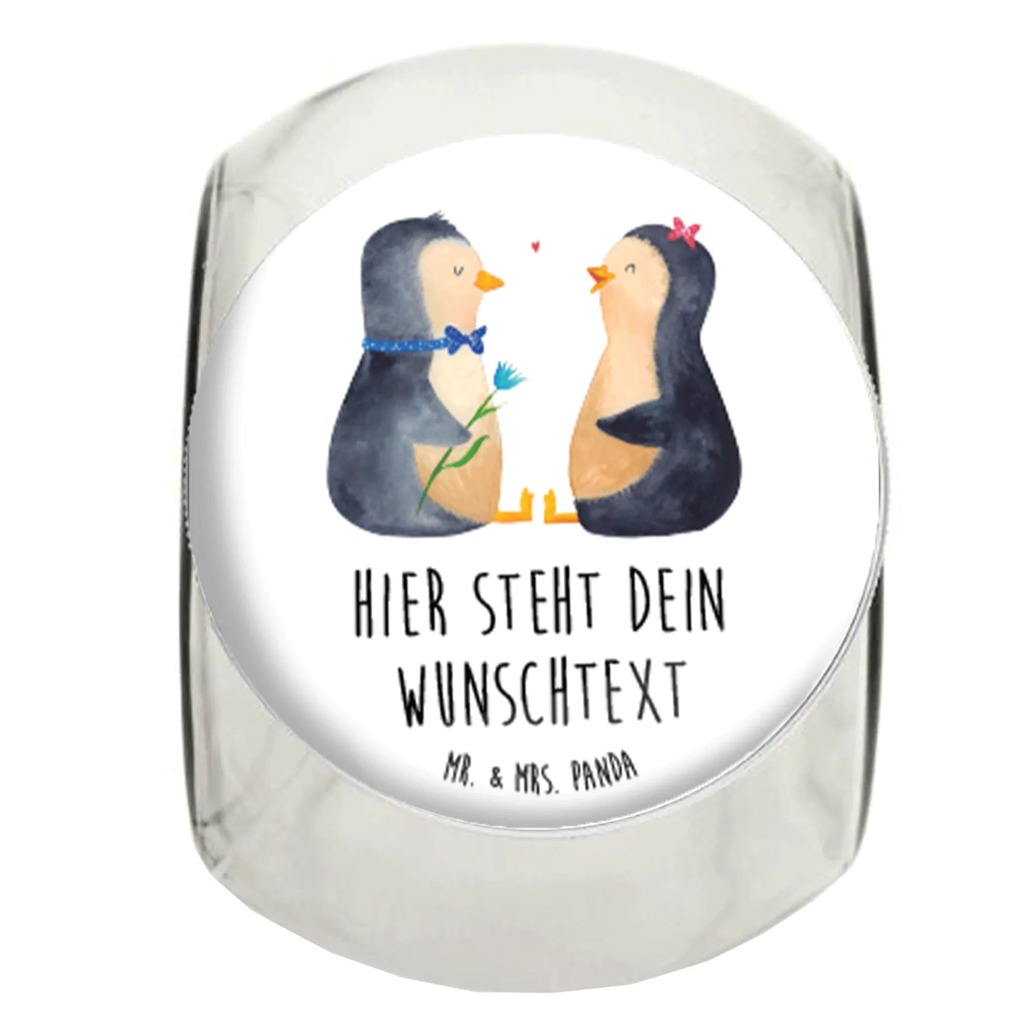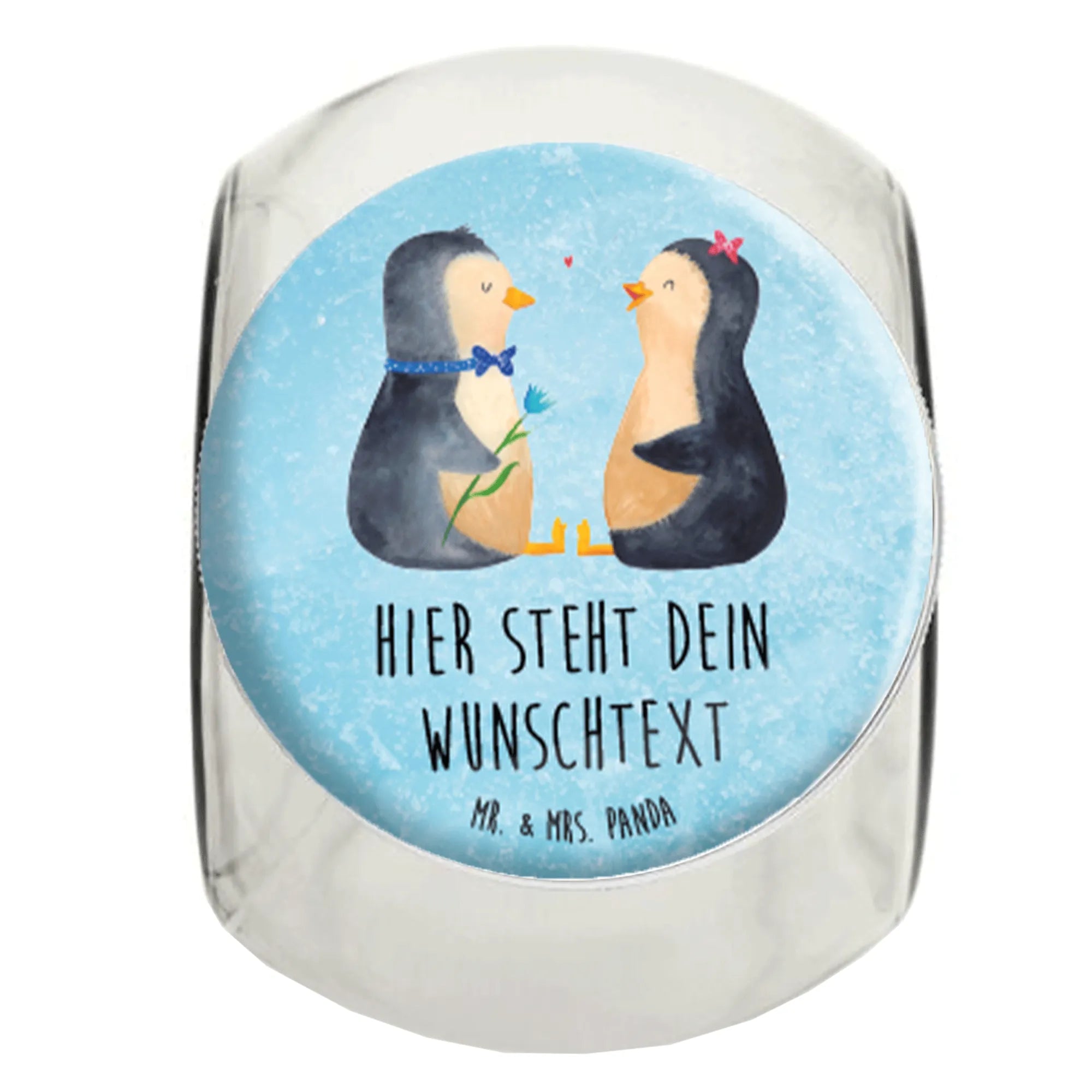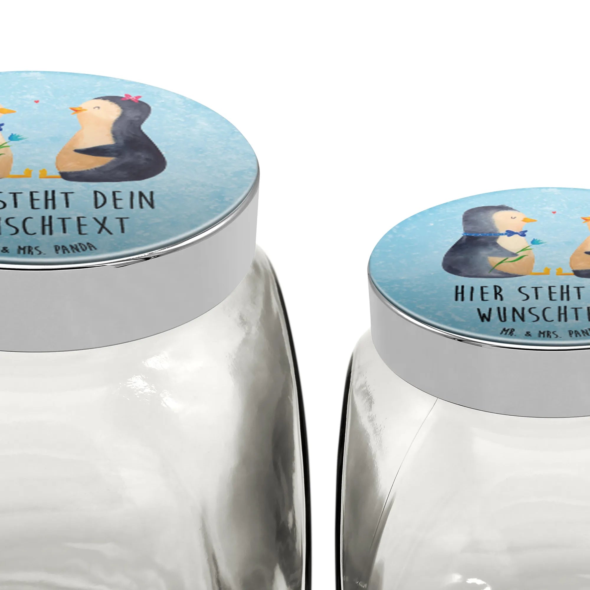 Das personalisierte Bonbonglas mit dem liebevollen Motiv des Pinguin Pärchen von Mr. & Mrs. Panda ist der perfekte Begleiter für alle, die Süßigkeiten, Kekse oder speziellen Tee stilvoll aufbewahren möchten.