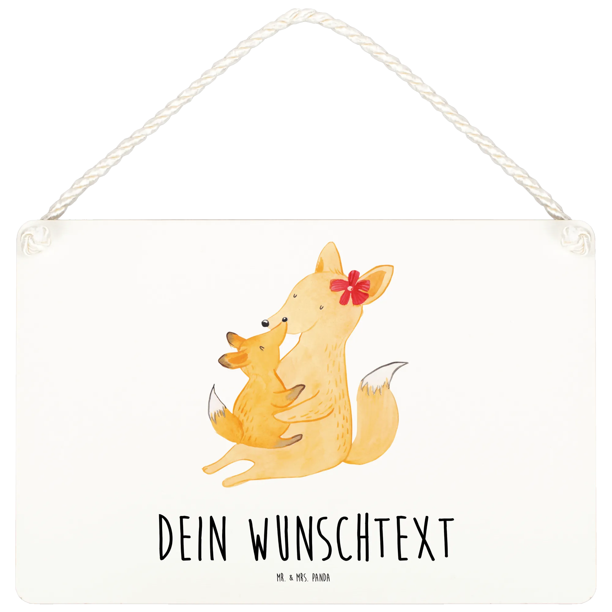 Die zwei Füchse, Mama und ihr Junges, umarmen sich zärtlich und strahlen Geborgenheit und Fürsorge aus. Sie haben ein warmes, gelb-orange gefärbtes Fell und eine rote Blume hinter dem Ohr der Mutter, die das Bild zusätzlich auflockert. Das personalisierte Deko Schild hat die Maße von DIN A6 und ist aus hochwertiger, beschichteter Holzfaser gefertigt, was für Langlebigkeit sorgt.