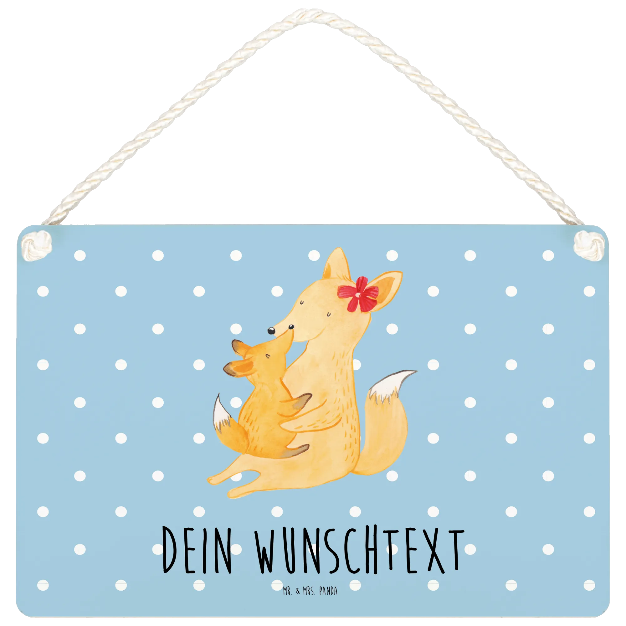 In einem zarten Pastellblau gehalten, zeigt das Schild eine berührende Darstellung von einer Füchsin, die ihr Junges zärtlich umarmt. Dieses Detail strahlt Wärme und Geborgenheit aus, und der Blick der Füchsin auf ihr Kind vermittelt all die Liebe, die sie füreinander empfinden.