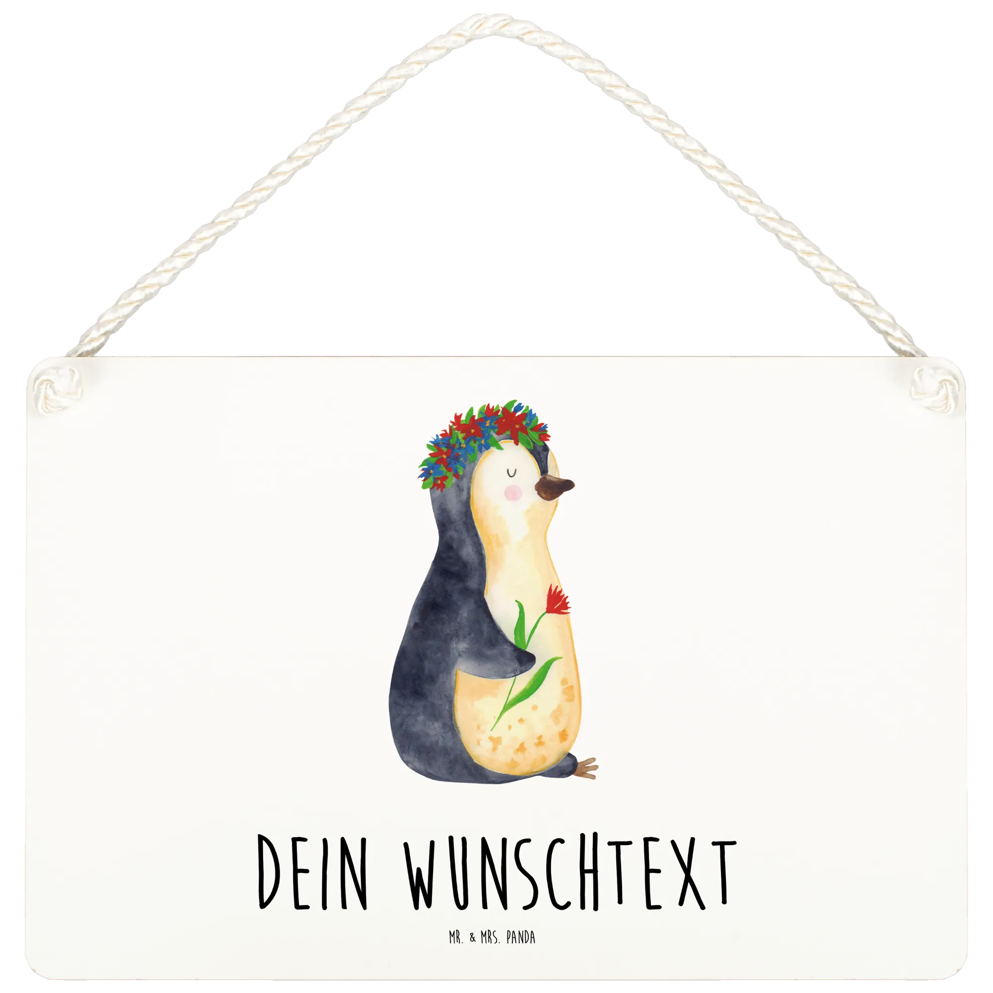 Personalisiertes Deko Schild Pinguin Blumenkranz - DIN A6 - Weiß