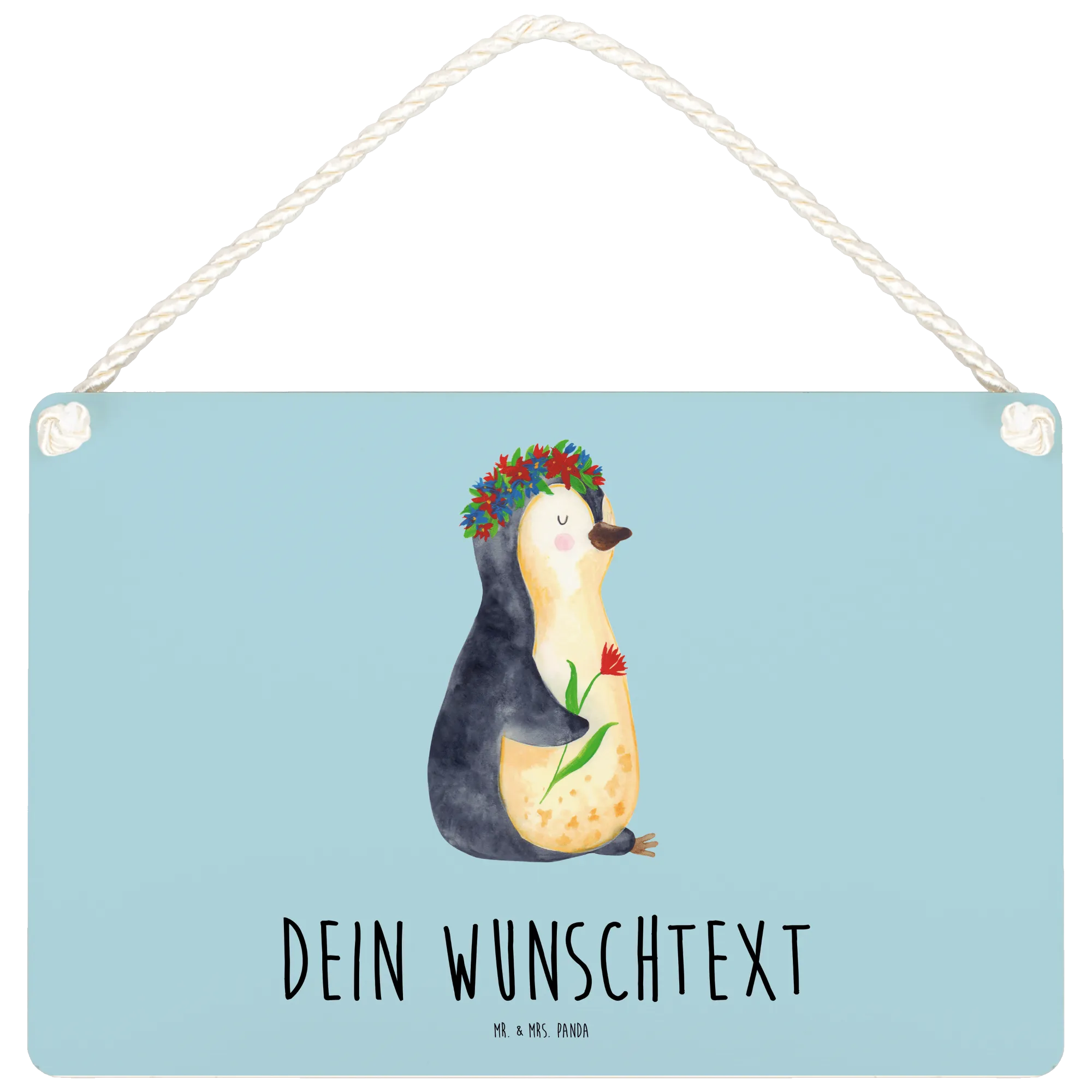Der süße Pinguin mit seinem Blumenkranz hat eine unnachahmliche Ausstrahlung. Das Schild misst im Format DIN A3 und ist aus hochwertiger und beschichteter Holzfaser gefertigt, damit du lange Freude daran hast. Die edlen Farben und der langlebige Druck machen es zu einem besonderen Highlight bei jeder Deko. Die Oberfläche ist beschichtet, sodass sie robust und beständig ist.