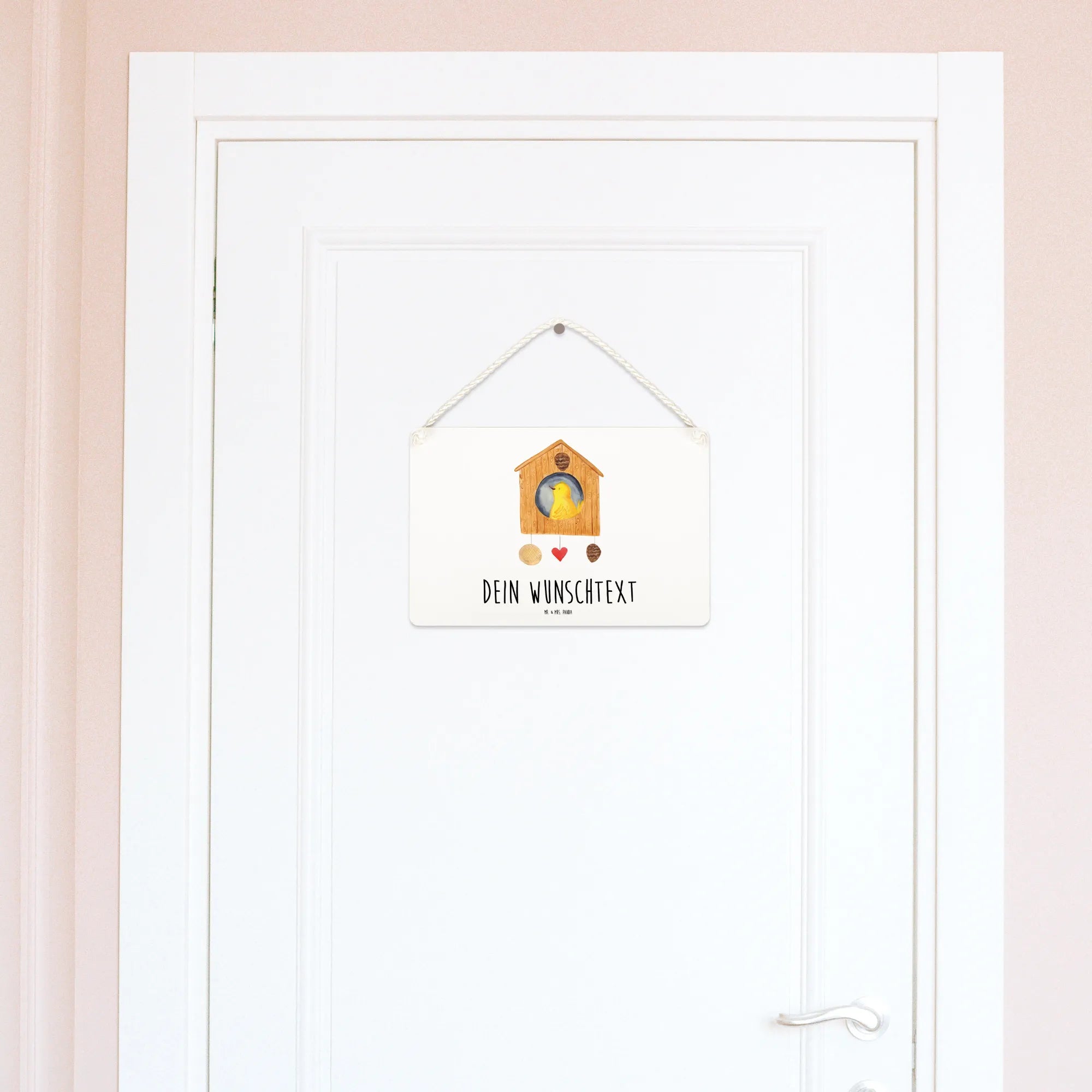 Das Schild ist personalisierbar mit deinem Wunschnamen, sodass du es ganz individuell gestalten kannst. Die fröhlichen Farben und der niedliche kleine Vogel, der in seinem behaglichen Vogelhaus sitzt, sorgen für ein Lächeln im Gesicht eines jeden Betrachters.