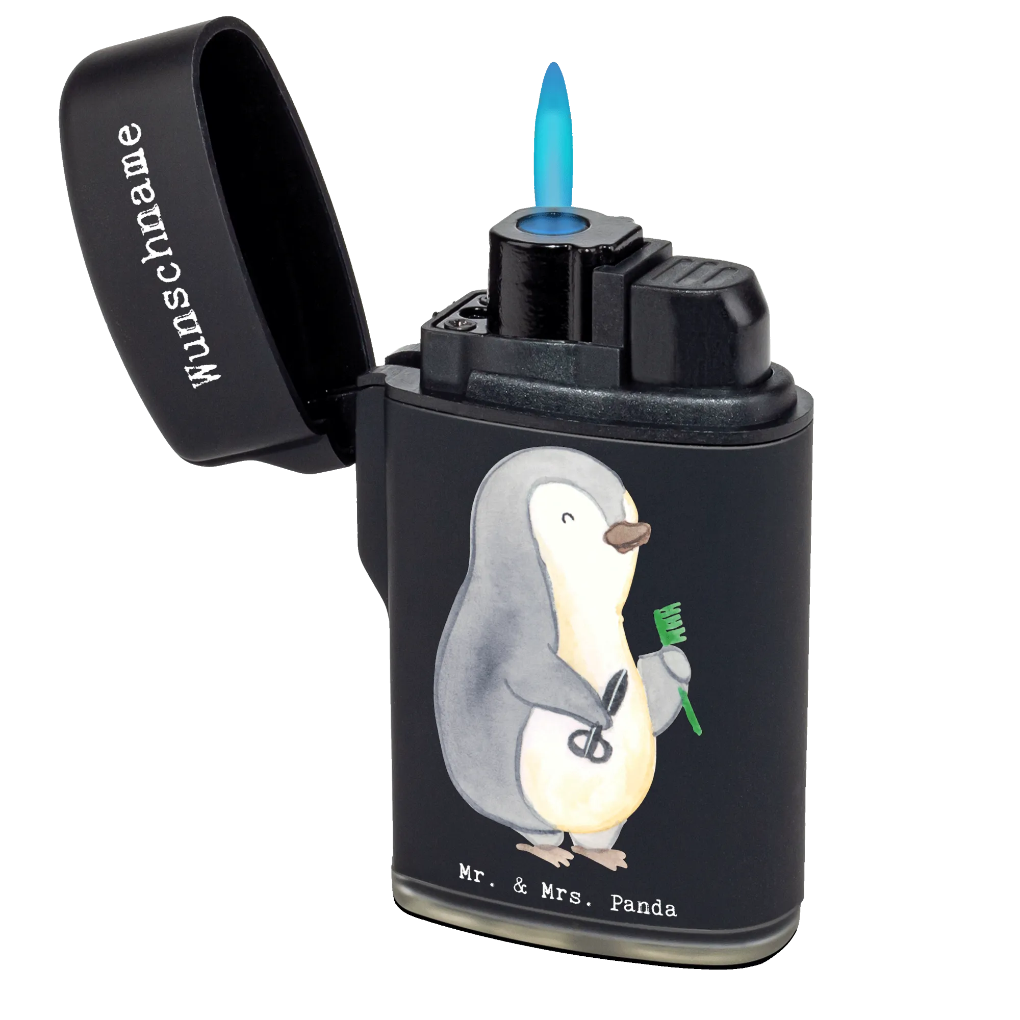 Das personalisierte Feuerzeug "Friseur mit Herz" von Mr. & Mrs. Panda ist das perfekte Geschenk für alle Frisöre und Haarstylisten! Ob für den eigenen Gebrauch oder als liebevolles Geschenk – dieses Feuerzeug ist ein echter Hingucker und zeigt, wie sehr Du Deinen Beruf liebst. Mit dem niedlichen Motiv eines Pinguins, der mit Kamm und Schere ausgestattet ist, bringt es ein Lächeln in jeden Friseursalon.