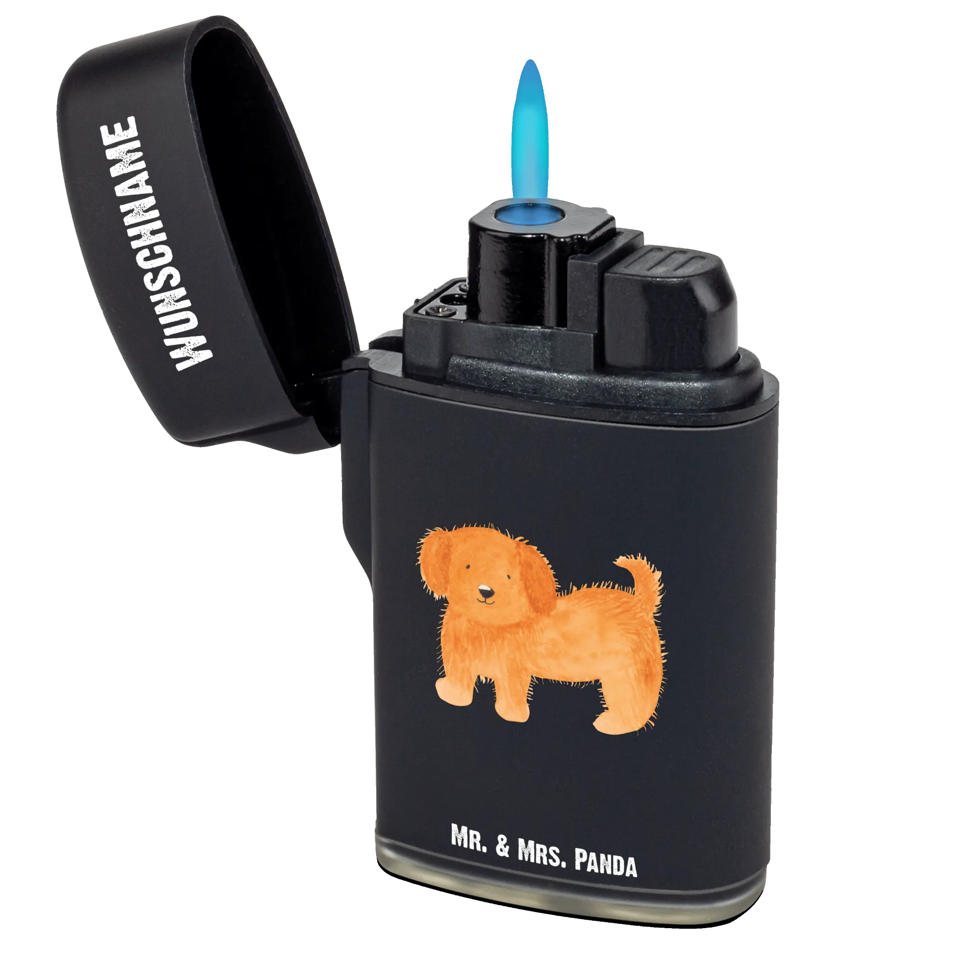 Das Feuerzeug lässt sich mit Wunschname oder Wunschtext personalisieren und wird so zum individuellen Alltagsbegleiter. Es ist nachfüllbar und stufenlos regelbar, der praktische Klappmechanismus macht die Handhabung einfach und sicher. Die schwarze Oberfläche setzt das niedliche Hunde-Motiv stilvoll in Szene.