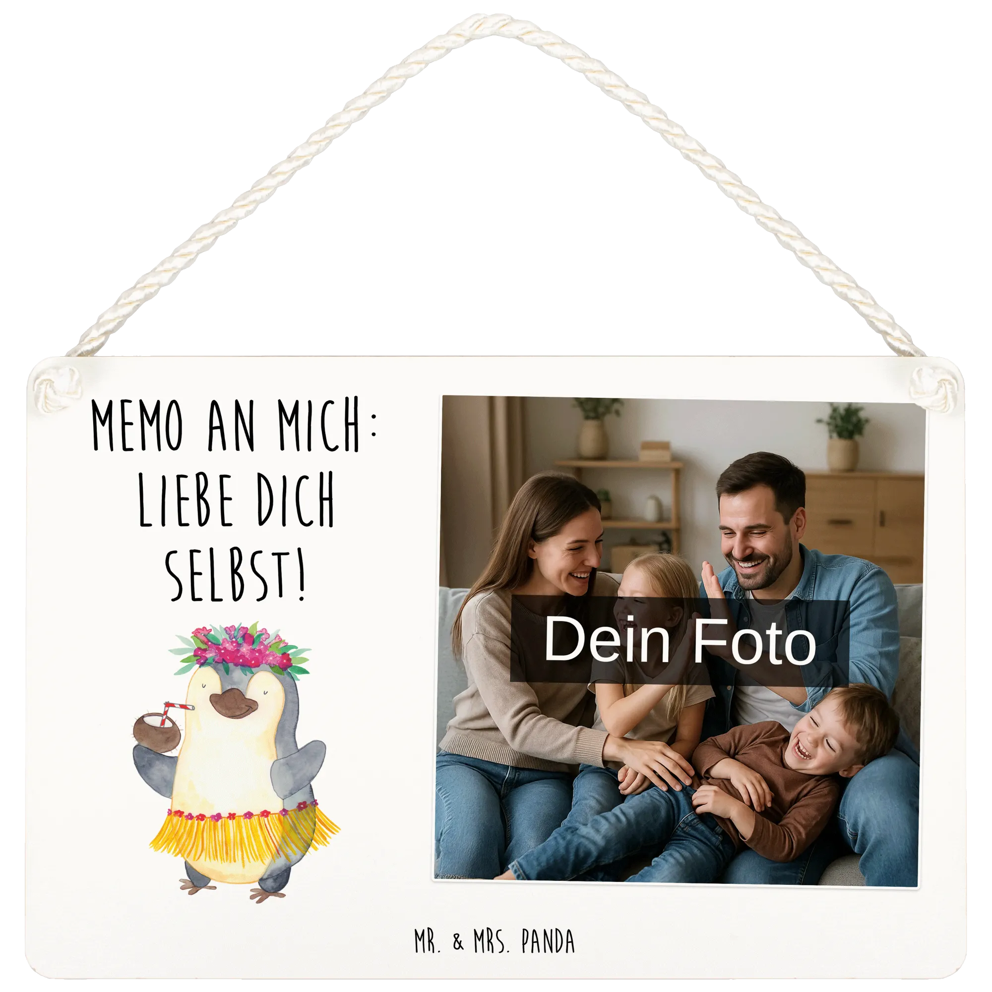 Entdecke das einzigartige personalisierte Foto Deko Schild von Mr. & Mrs. Panda! Mit den Abmessungen von 210 mm x 148 mm ist es perfekt für dein Zuhause. Egal ob an der Wand oder an der Tür, dieses Schild ist mehr als nur Dekoration. Es ist mit tollen Sprüchen und Bildern bedruckt und lässt sich mit deinem speziellen Foto anpassen. Denke daran, die besten Bilder in hoher Auflösung hochzuladen, um ein optimales Druckergebnis zu erzielen. Achte darauf, dass das Foto gut zugeschnitten ist, damit nichts Wichtiges verloren geht. Lade nur Bilder hoch, bei denen du die Rechte besitzt, besonders wenn es um Freunde oder Familie geht. Hergestellt aus nicht nur schöner, sondern auch langlebiger beschichteter Holzfaser, wird das Schild edel bedruckt und sorgt für einen stilvollen Look. Und mit der niedlichen Kordel macht das Aufhängen gleich noch mehr Spaß!