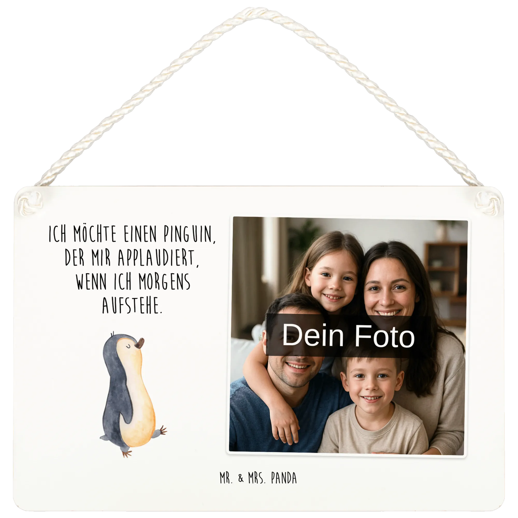 Mach dein Zuhause einzigartig mit unserem personalisierten Foto Deko Schild von Mr. & Mrs. Panda! Die Maße von 148 mm x 105 mm sorgen dafür, dass es sich überall harmonisch einfügt. Du kannst es nach deinen Wünschen mit deinem Lieblingsfoto und tollen Sprüchen von Mr. & Mrs. Panda gestalten. Sorge dafür, dass dein Bild in bester Qualität hochgeladen wird, damit das Endprodukt wirklich beeindruckt. Das langlebige Material bewahrt die Farben und sorgt für einen Blickfang an deiner Tür oder Wand. Ob als individuelles Geschenk oder einfach für die eigene Wohnung, dieses Schild ist immer eine gute Idee! Zudem macht die Kordel das Anbringen zum Kinderspiel und verleiht dem Schild einen stilvollen Touch.