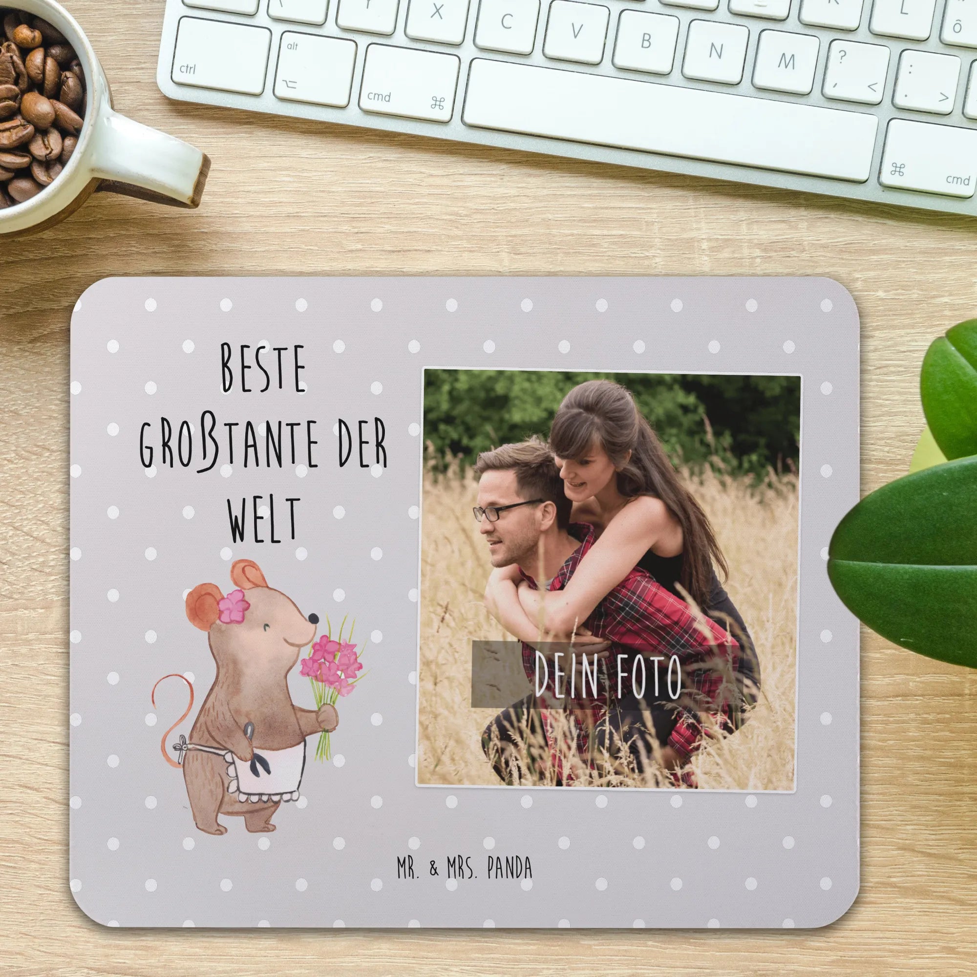 Das personalisierte Foto Mauspad mit dem Motiv "Beste Großtante der Welt" von Mr. & Mrs. Panda ist das perfekte Geschenk für all die tollen Großtanten, die in deinem Leben eine wichtige Rolle spielen. Mit einem charmanten Design, das eine süße Maus mit einer Schürze und einer Gartenschere zeigt, bringt dieses Mauspad fröhliche Elemente in den Alltag.