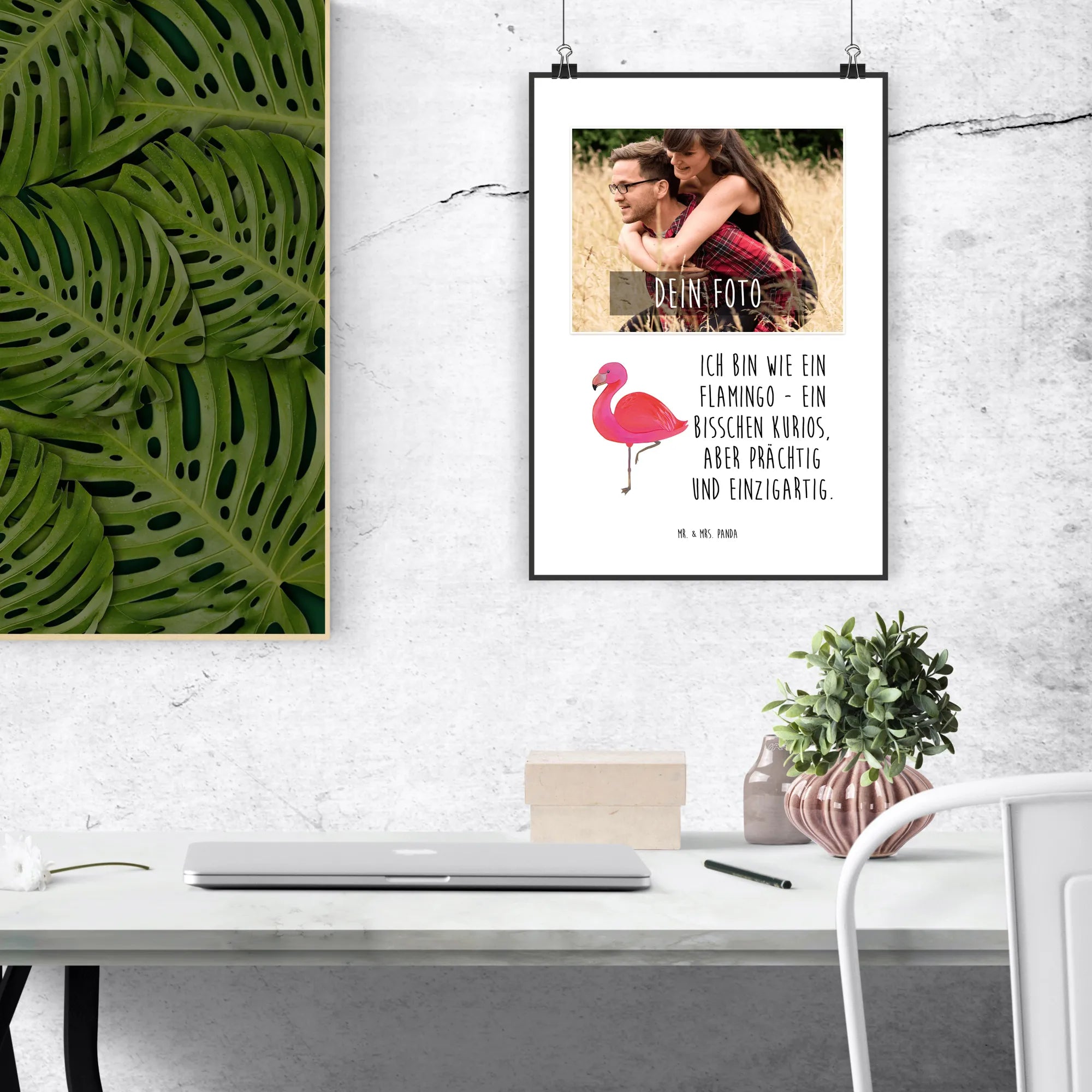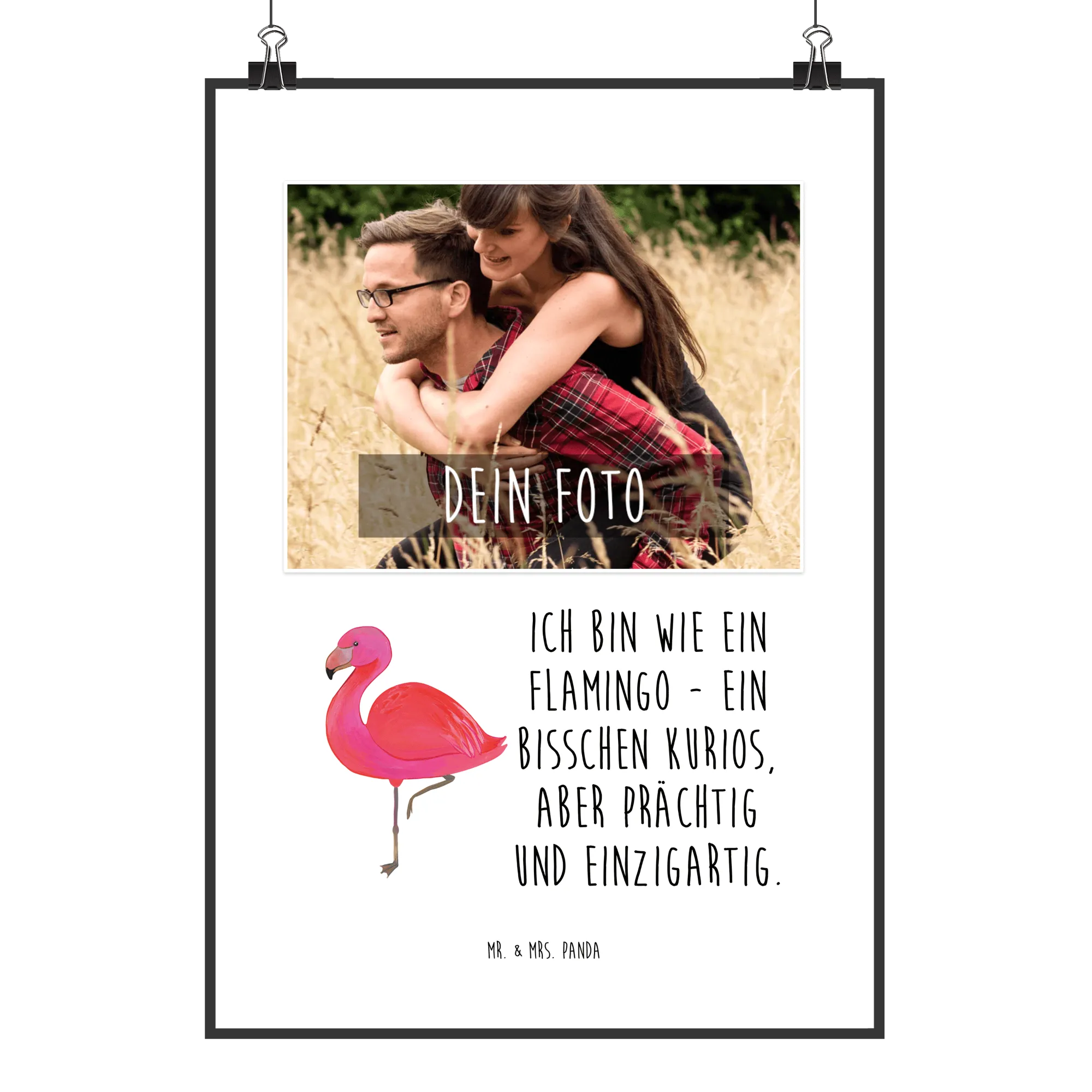 Entdecke unser wunderschönes, personalisiertes Foto Poster aus der Flamingo-Kollektion von Mr. & Mrs. Panda! Dieses einzigartige Poster ist mehr als nur ein Stück Wanddeko – es ist ein Ausdruck von Selbstliebe und Stolz, ideal für alle, die das Besondere lieben. Mit unserem Spruch „Ich bin wie ein Flamingo - ein bisschen kurios, aber prächtig und einzigartig.“ bringt es einen Hauch von Individualität in jedes Zuhause.
