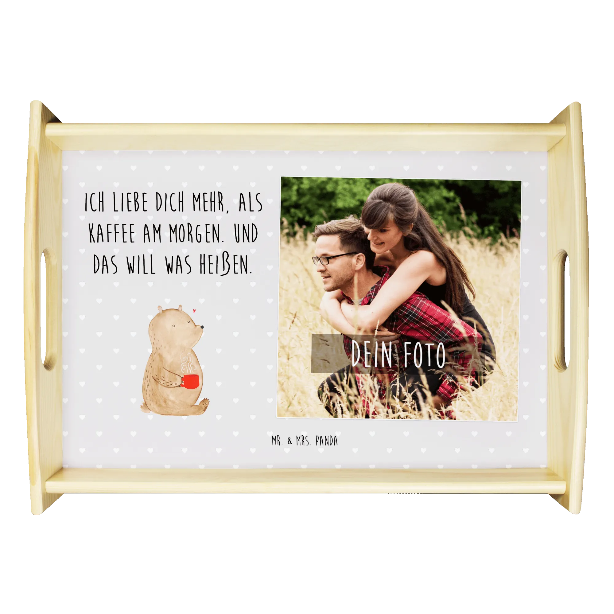 Entdecke das perfekte Geschenk für deine Liebsten mit unserem personalisierten Foto Serviertablett "Bär Morgenkaffee" aus der zauberhaften Kollektion Liebe von Mr. & Mrs. Panda. Dieses einzigartige Tablett ist nicht nur ein praktisches Küchenutensil, sondern auch ein liebevoll gestaltetes Liebeszeichen.