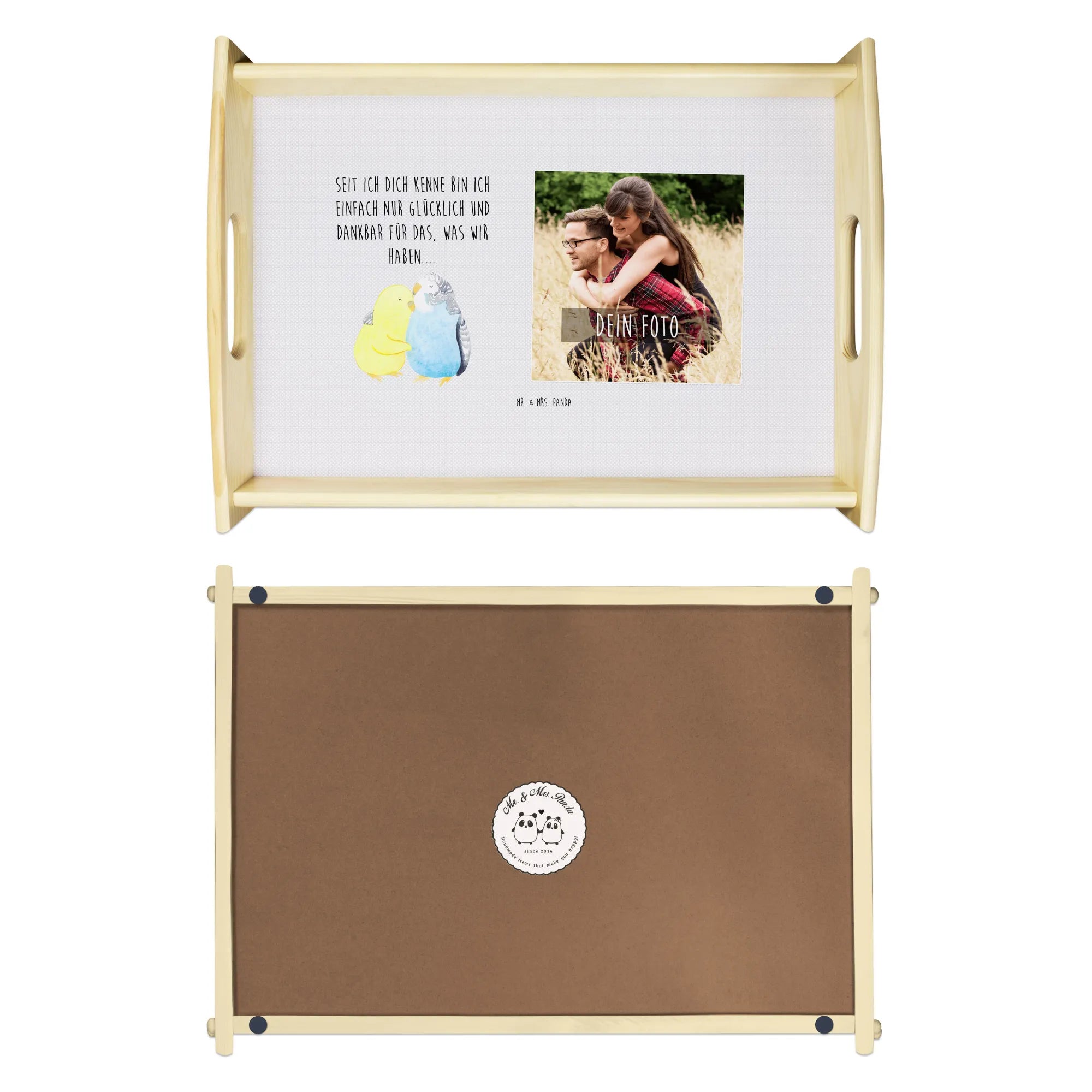 Das personalisierte Foto Serviertablett mit dem niedlichen Motiv "Wellensittich Liebe" von Mr. & Mrs. Panda ist das ideale Geschenk für all jene, die ihre Liebe oder besondere Momente gebührend feiern möchten. Ob für den Jahrestag, den Hochzeitstag oder als romantisches Liebesgeschenk – dieses liebevoll gestaltete Tablett bringt nicht nur Stil, sondern auch eine persönliche Note in jeden Haushalt. Die beiden Wellensittiche, die sich zärtlich aneinander kuscheln, symbolisieren Verbundenheit, Nähe und das innige Vertrauen, das in einer Beziehung besteht.