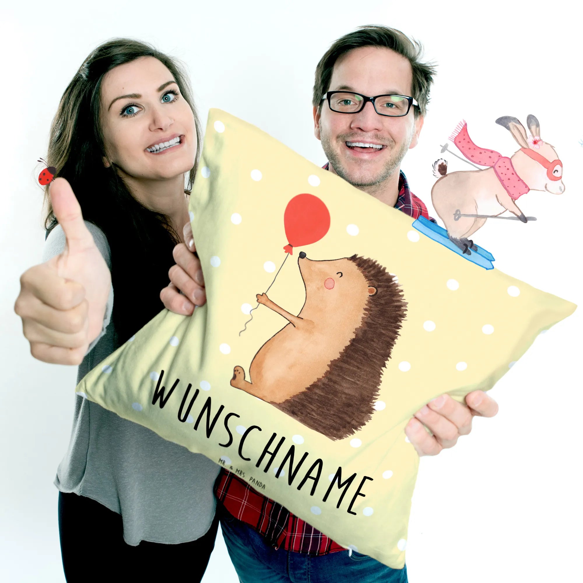 Verleihe deinem Wohnraum einen persönlichen Touch mit dem einzigartigen, personalisierten Kissen von Mr. & Mrs. Panda! Das Kissen hat eine praktische Größe von 400 mm x 400 mm und wurde mit einem Reißverschluss versehen, um die superweiche Füllung einfach herausnehmen und waschen zu können. Es ist mit eindrucksvollen Motiven und Sprüchen bedruckt, die deinem Raum Leben einhauchen. Du kannst das Kissen ganz individuell gestalten, indem du einen Namen oder Wunschtext hinzufügen lässt. Perfekt als Dekoration auf deinem Sofa oder ein Geschenk für einen besonderen Menschen! Hergestellt aus flauschiger Mikrofaser, ist es nicht nur schön, sondern auch extrem bequem. Wasche es bei 30° C, damit die Farben lebendig bleiben und es lange neu aussieht.