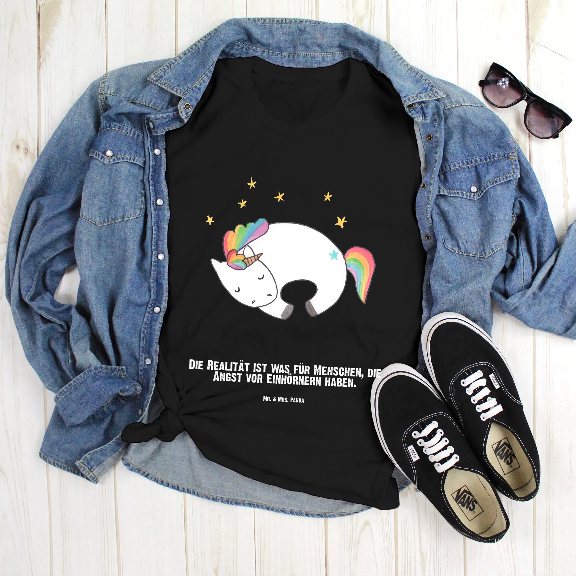 Du willst jemandem eine Freude machen, die von Einhörnern träumt? Unser personalisierbares Einhorn T-Shirt aus der Einhorn - Kollektion von Mr. & Mrs. Panda ist ein zauberhaftes Geschenk für alle, die Fantasie, Humor und Gemütlichkeit lieben. Das Motiv zeigt ein niedliches, schlafendes Einhorn und trägt den frechen Spruch: „Die Realität ist was für Menschen, die Angst vor Einhörnern haben.“