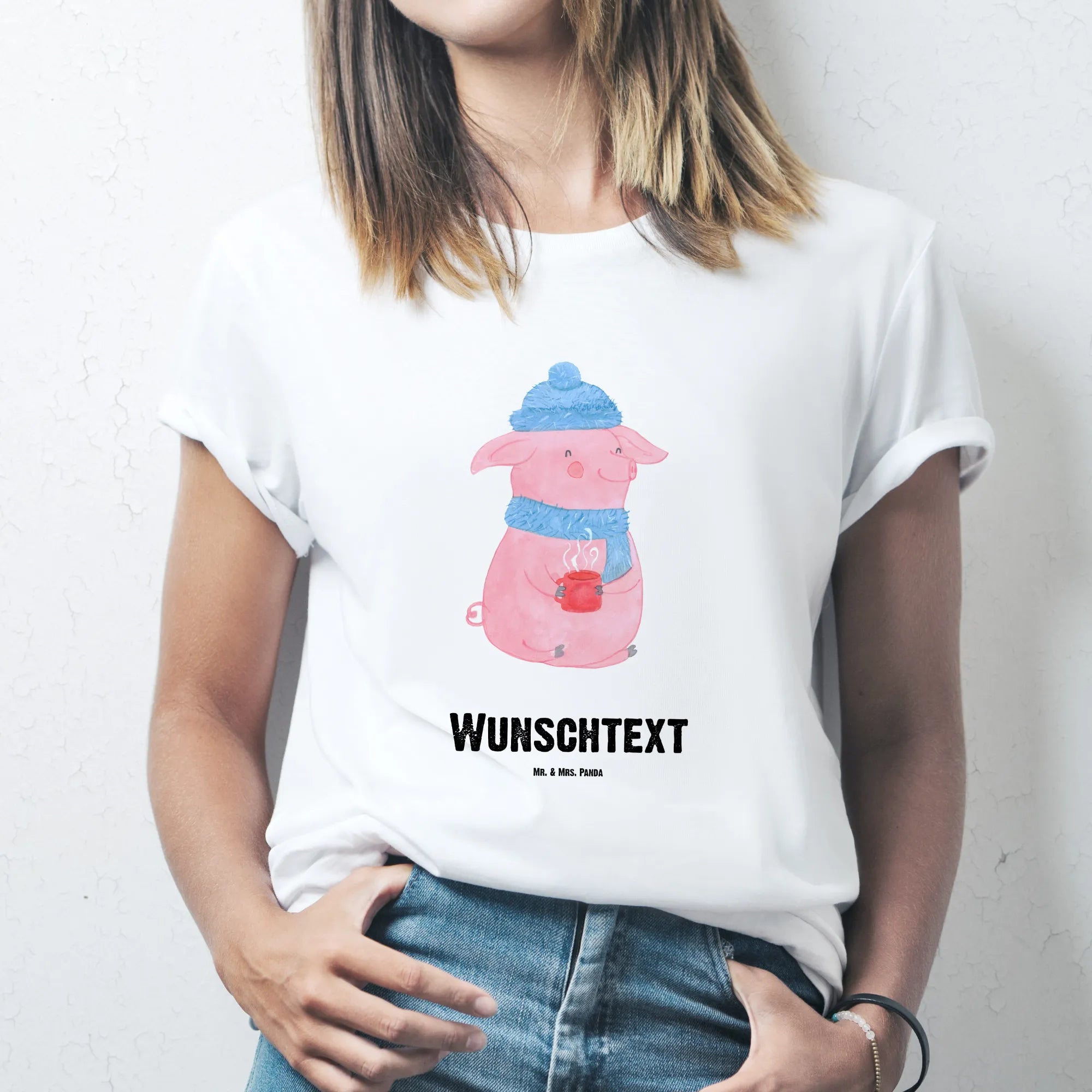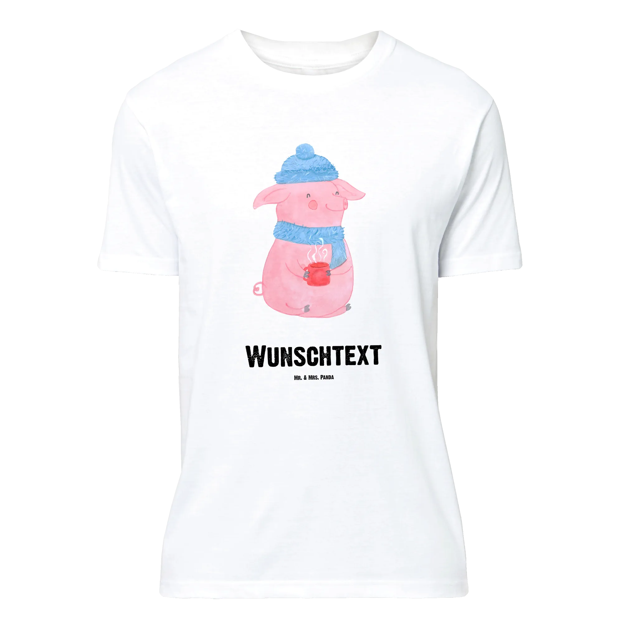 Das fröhliche, rosa Glühschwein auf dem T-Shirt, das mit einer blauen Mütze und einem passenden Schal ausgestattet ist, bringt jeden zum Schmunzeln. Und wer könnte bei einem so süßen Motiv nicht an den heißen Punsch oder einen leckeren Glühwein denken?