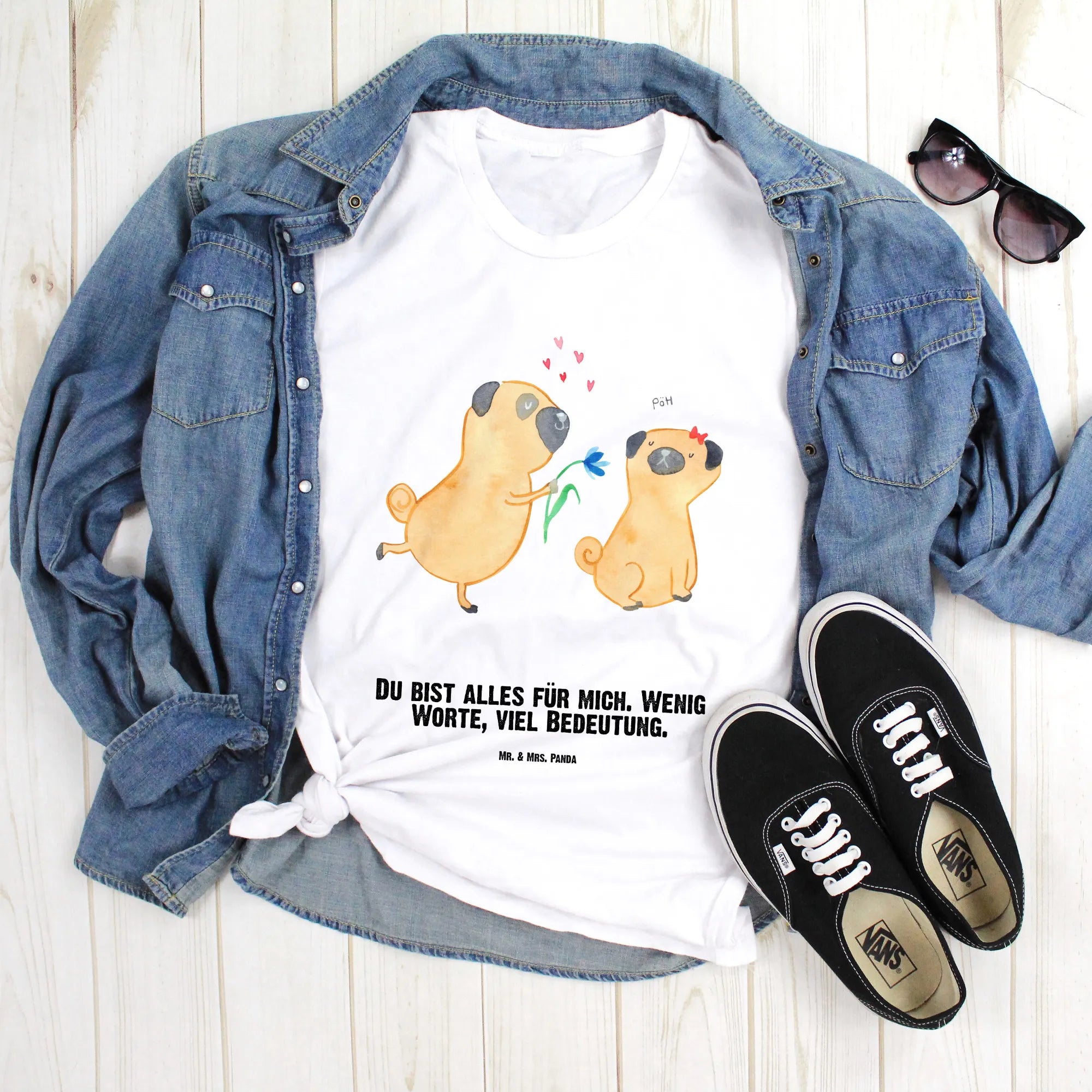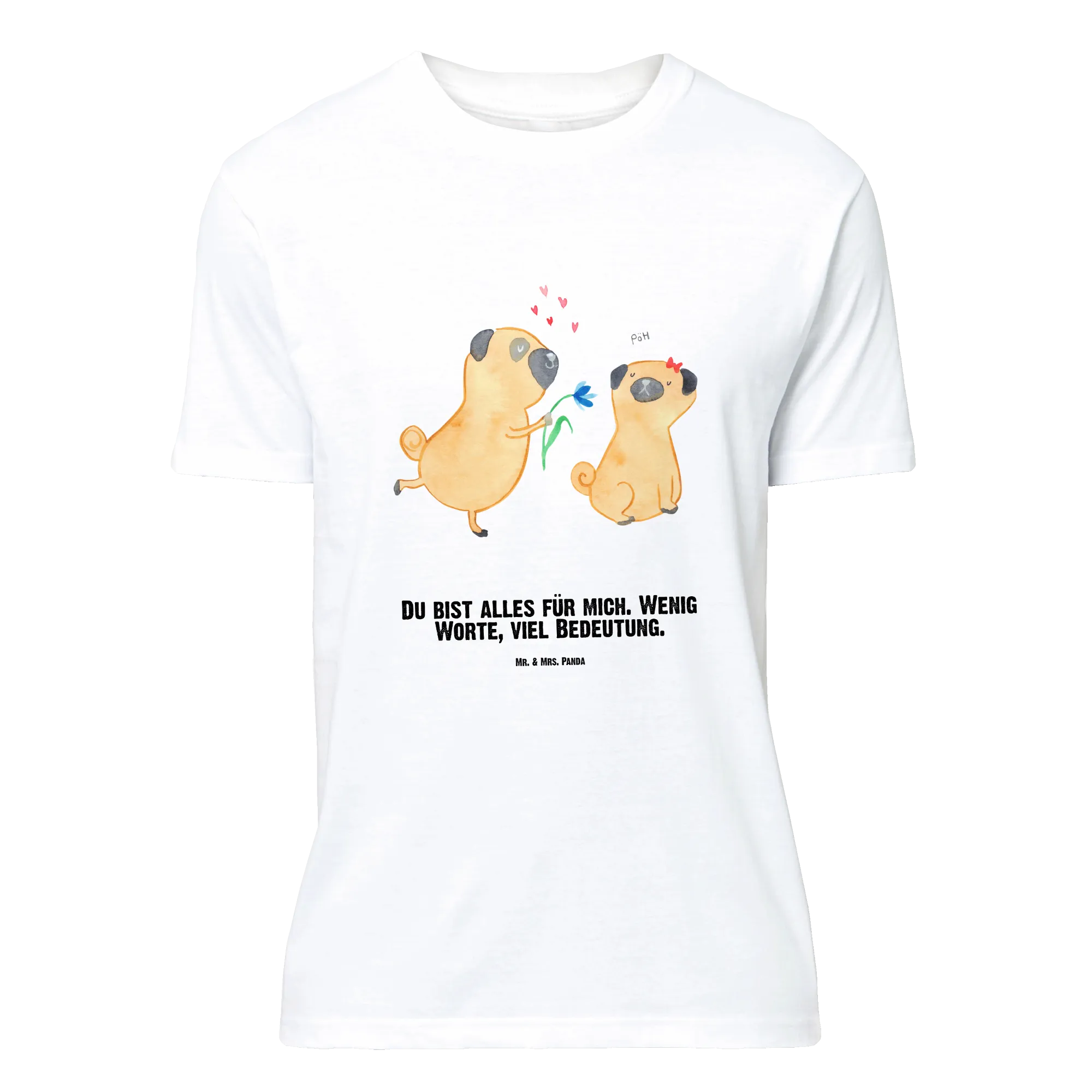 Mit einem liebevoll designten Aufdruck von zwei verliebten Möpsen, die sich eine Blume schenken, ist es nicht nur ein Kleidungsstück – es ist ein Ausdruck von Zuneigung und Hundeliebe. Das Slogan „Du bist alles für mich. Wenig Worte, viel Bedeutung.“ macht dieses Shirt zu etwas ganz Besonderem.