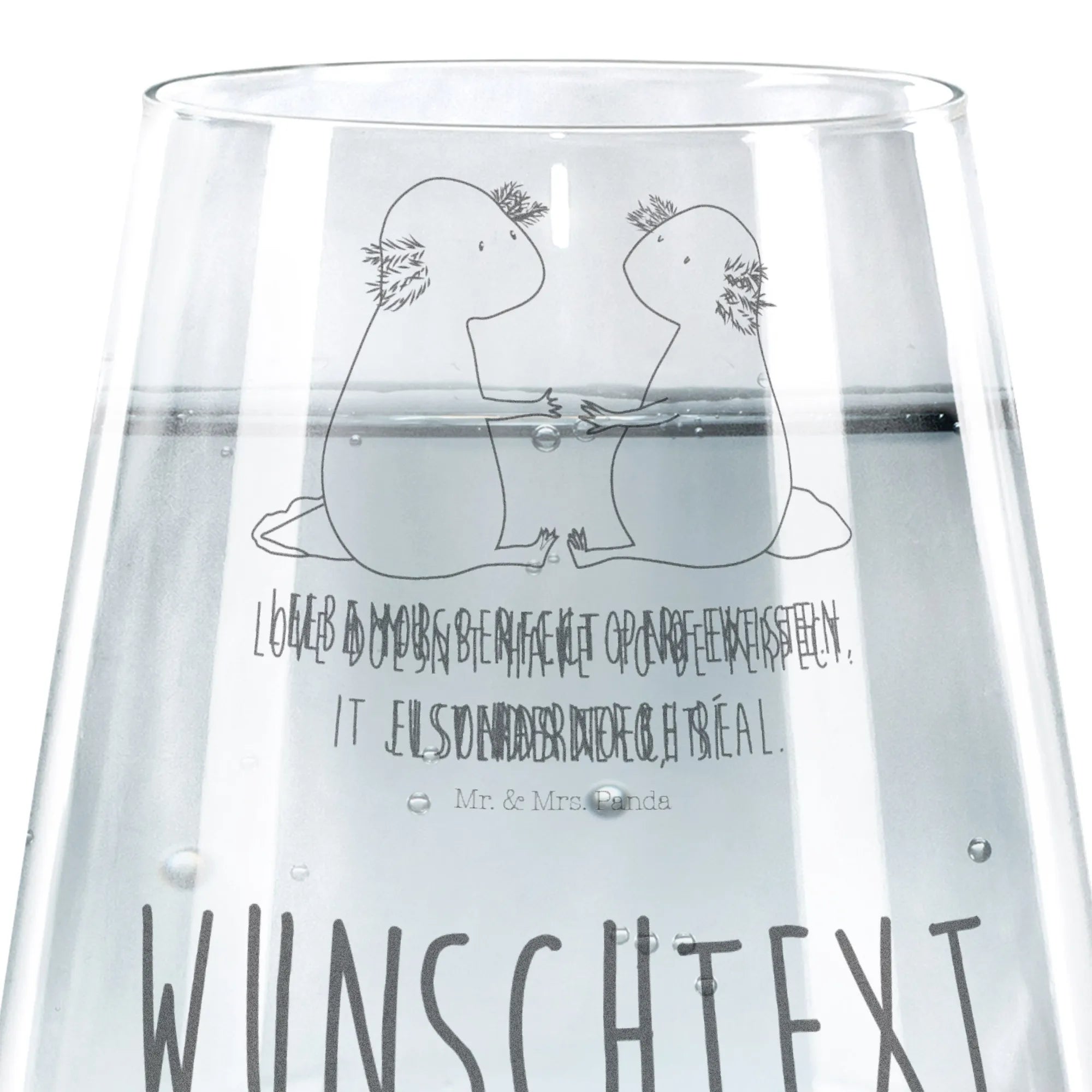 Das personalisierte Trinkglas Axolotl Liebe von Mr. & Mrs. Panda ist das perfekte Geschenk für deine Liebsten. Mit dem zauberhaften Motiv von zwei niedlichen Axolotln, die sich händchenhaltend anstarren, strahlt dieses Glas pure Romantik aus.