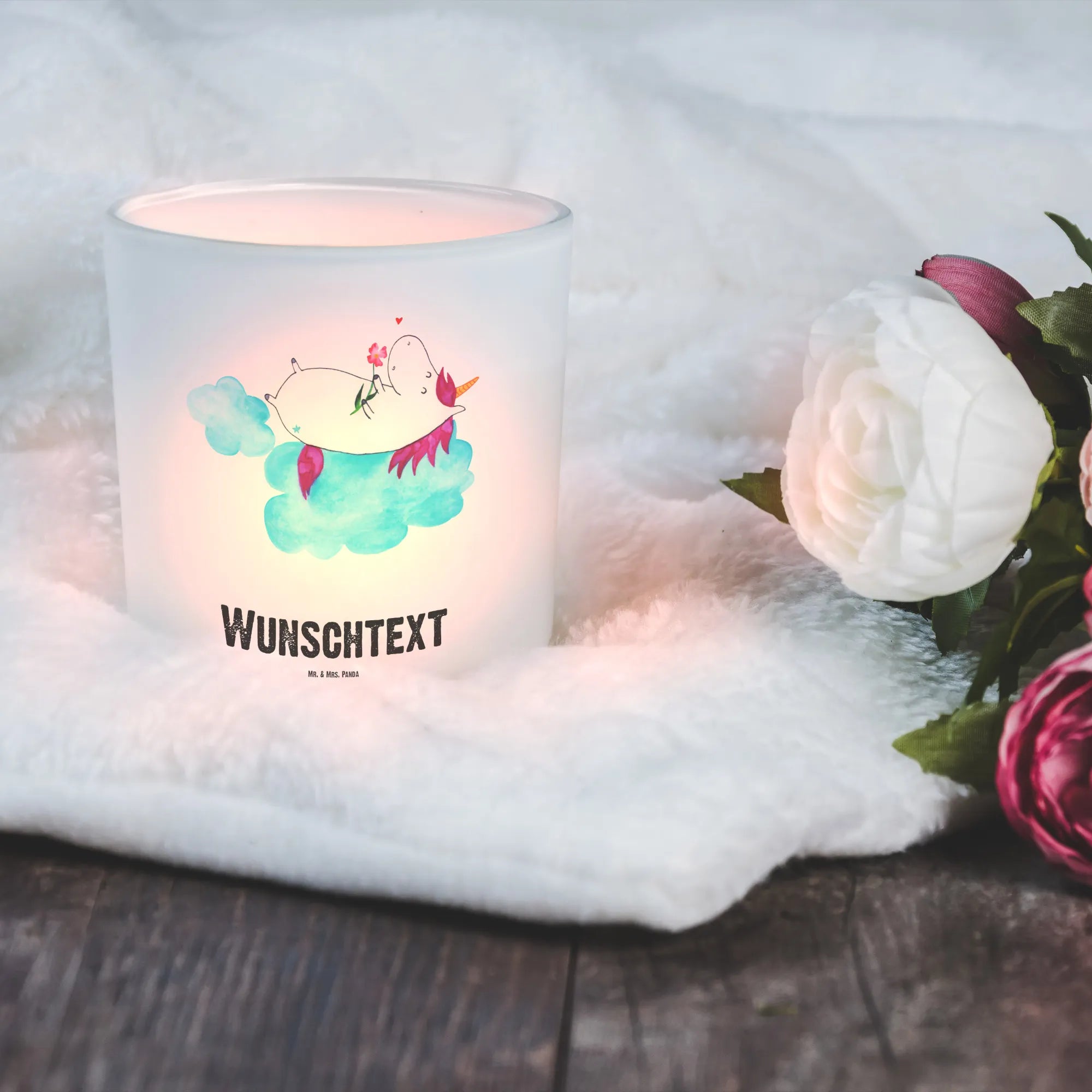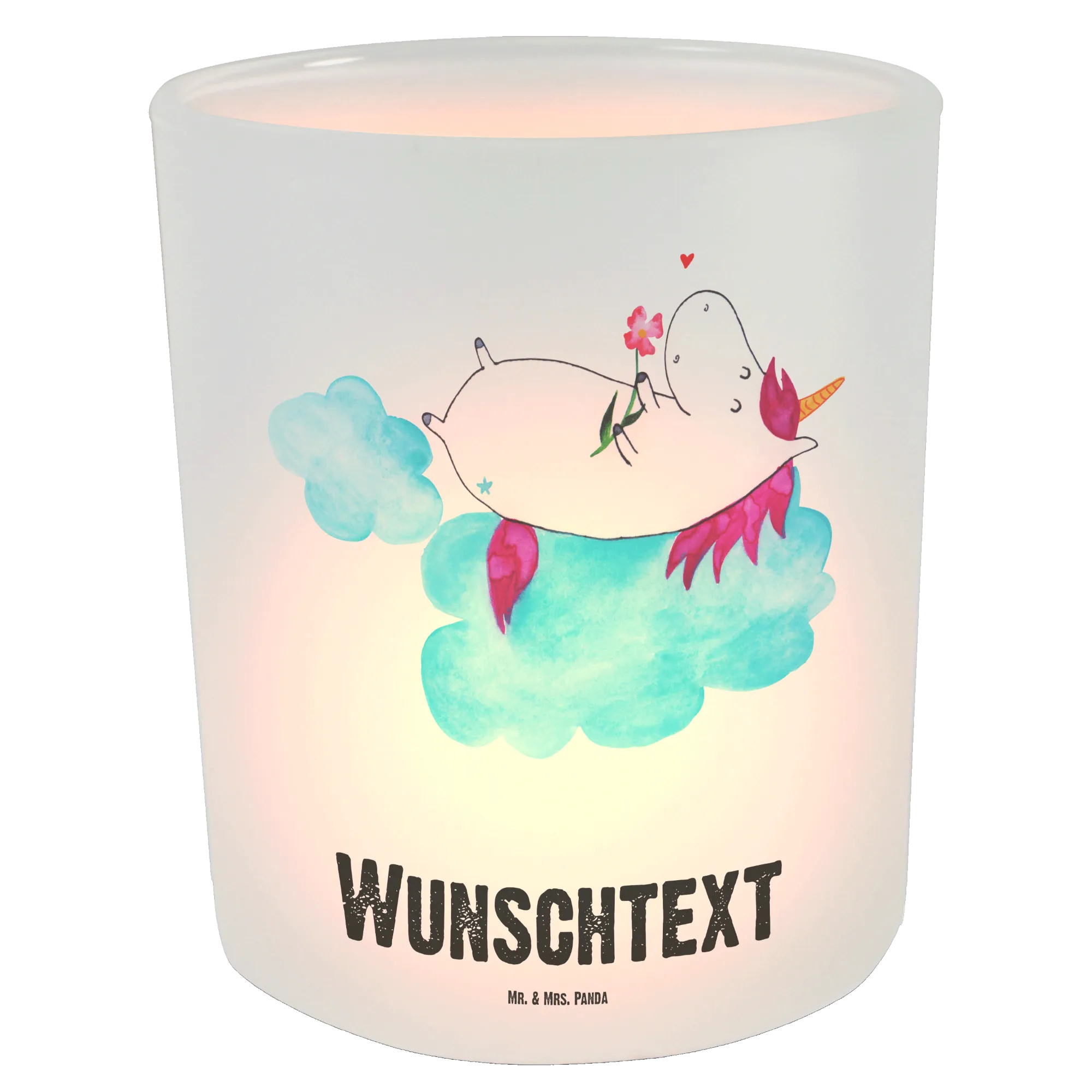 Das personalisierte Windlicht 'Einhorn verliebt auf Wolke' von Mr. & Mrs. Panda ist nicht nur ein außergewöhnliches Deko-Element, sondern auch ein ganz besonderes Geschenk, das Herzen höher schlagen lässt.
