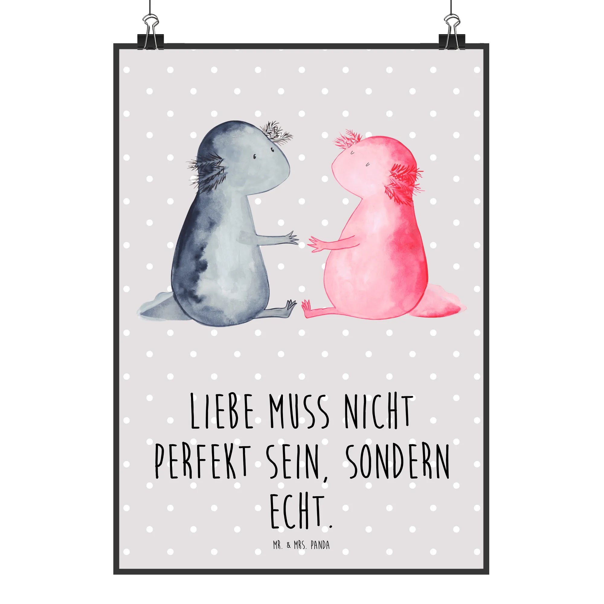 Axolotl Liebe Poster von Mr. & Mrs. Panda – ein zauberhaftes Wandposter, das Geschichten erzählt. Zwei niedliche Axolotl sitzen sich gegenüber, halten Händchen und versprühen pure Zärtlichkeit. Der pastellige Grau-Hintergrund lässt die Aquarellfarben warm und ruhig wirken und schafft eine gemütliche Stimmung in jedem Raum. 💕