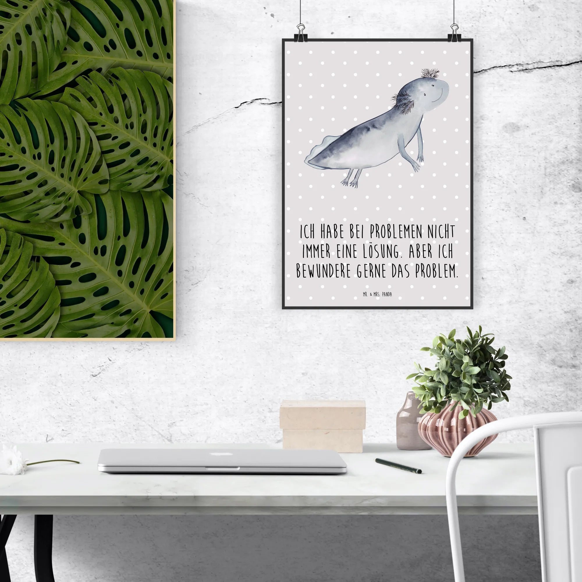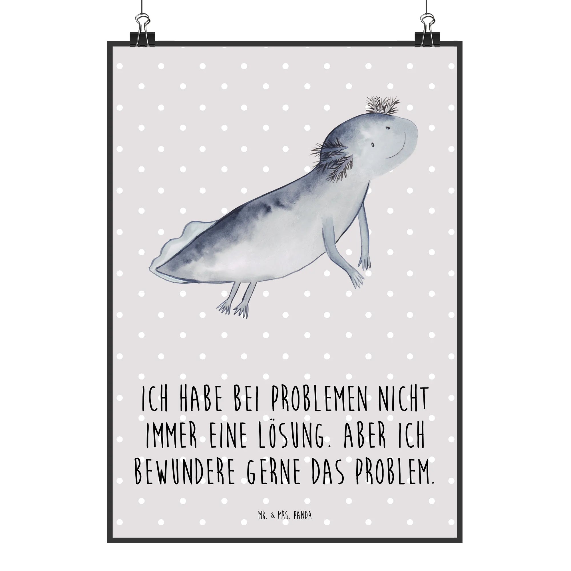 Mit dem Slogan 'Ich habe bei Problemen nicht immer eine Lösung. Aber ich bewundere gerne das Problem.' ist es zudem ein ideales Motiv für all jene, die sich gerne mit etwas Humor dem Alltag stellen. Dieses Poster aus der Axolotl-Kollektion von Mr. & Mrs. Panda wurde von Mrs. Panda mit viel Liebe handgezeichnet und lässt sich wunderbar kombinieren mit weiteren Motiven der Kollektion.