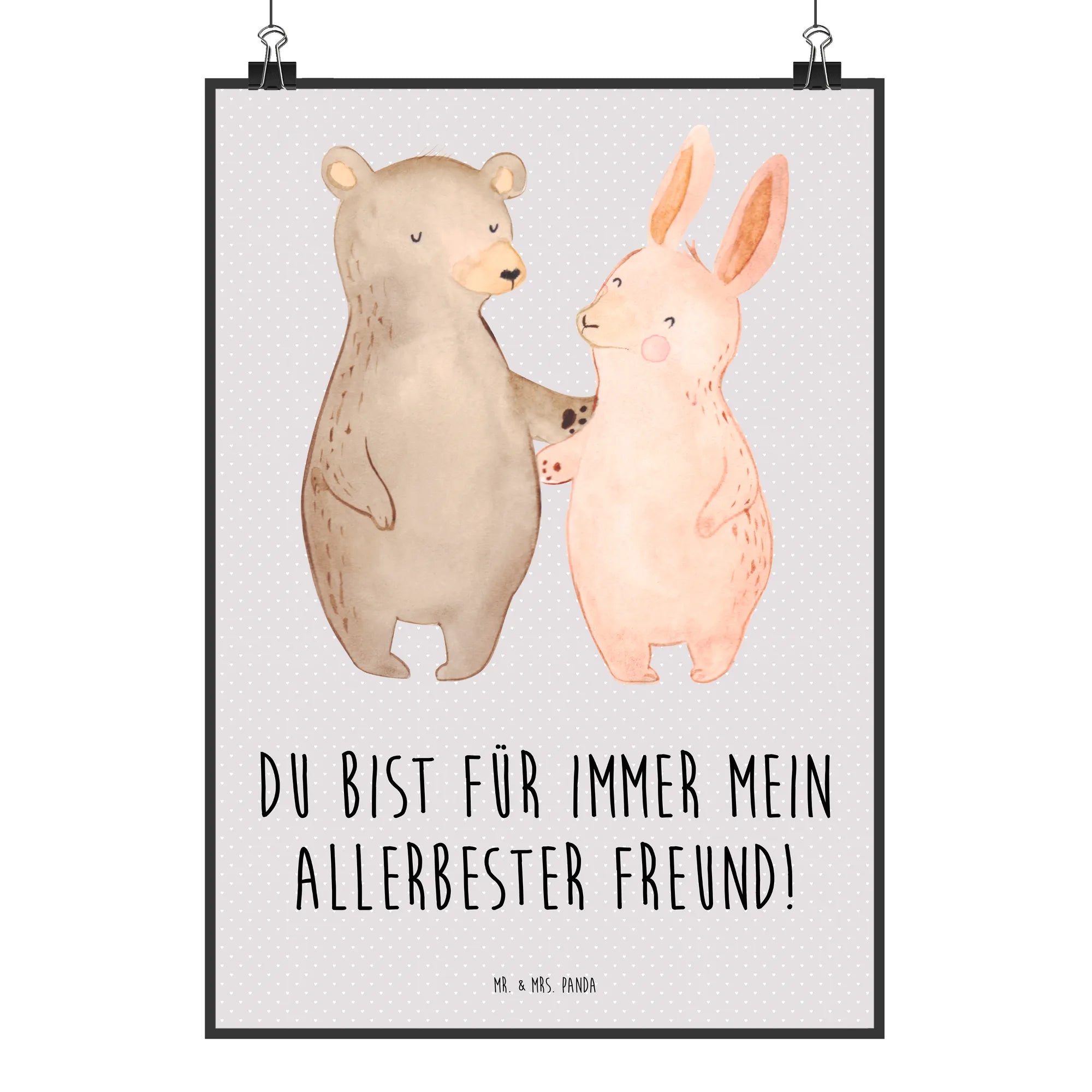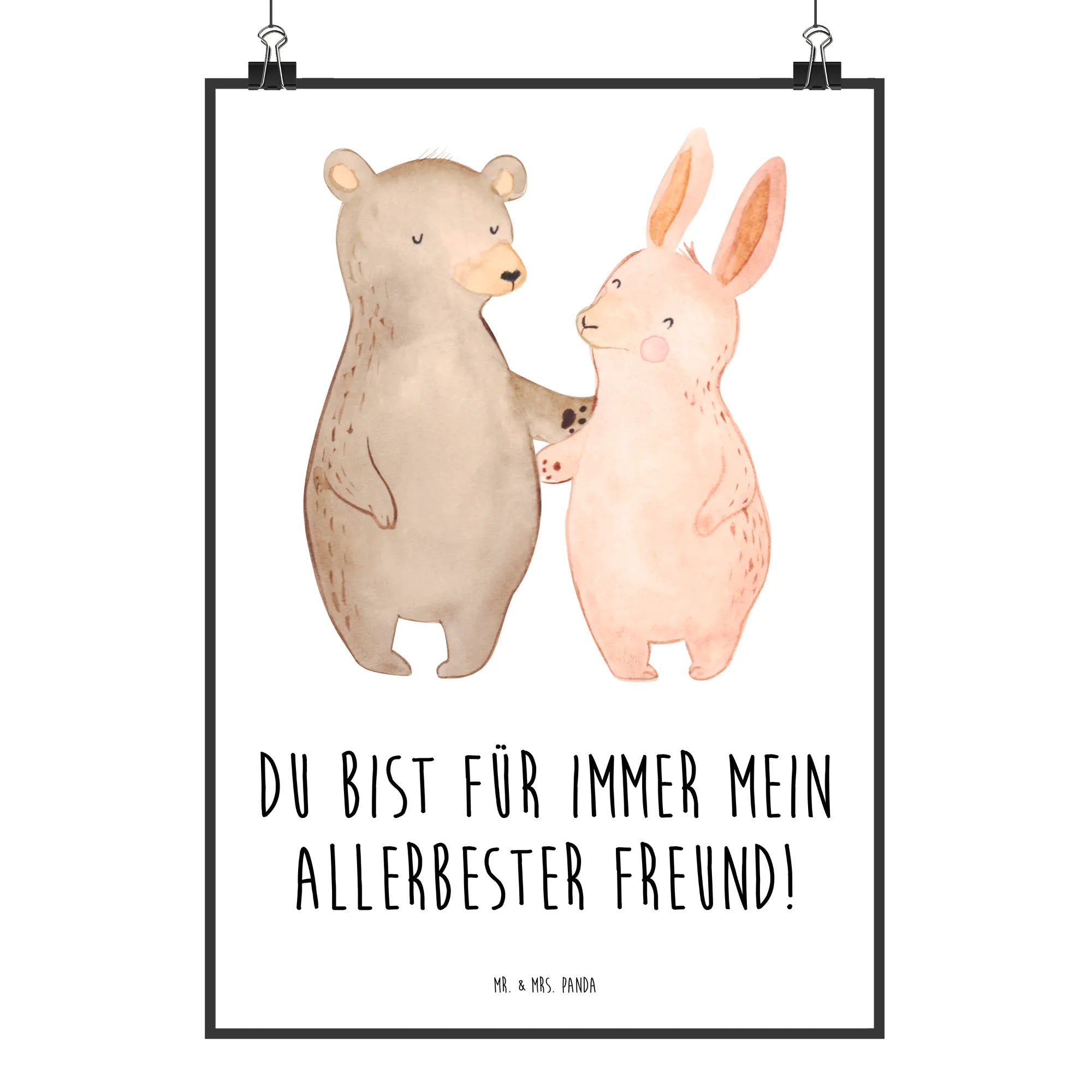 In diesem bezaubernden Motiv von Mr. & Mrs. Panda sehen wir einen Bär und einen Hase in inniger Umarmung vereint. Diese fröhliche Szene erinnert uns an die wahren Werte der Freundschaft und die Freude, die beste Freunde in unser Leben bringen. Die sanften Farben und die liebevollen Gesichtsausdrücke machen es zu einem perfekten Geschenk für jeden an deinem Herzen liegenden Freund oder Freundin. Der Spruch 'Du bist für immer mein allerbester Freund!' verströmt Wärme und Geborgenheit und zeigt, dass es nicht nur um das Teilen von Momenten geht, sondern um das Fühlen der Zuneigung, die niemals verblasst.