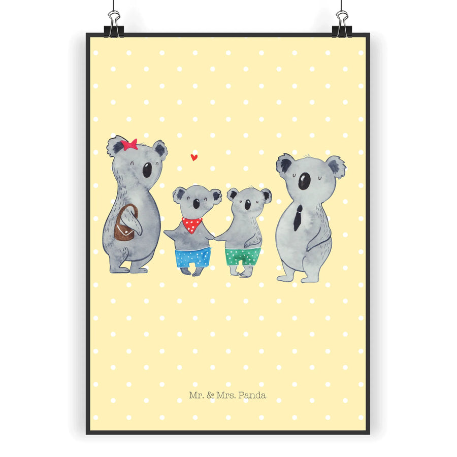 Ein wunderschönes und edles Poster von Mr. & Mrs. Panda: Das „Koala Familie zwei“ Poster aus unserer liebevollen Familien-Kollektion ist mehr als reine Wanddekoration — es erzählt von Nähe, Geborgenheit und gemeinsamen Momenten. Die handgezeichnete Aquarell-Illustration von Mrs. Panda zeigt vier Koalabären in einer warmen, fröhlichen Szene: die Mutter mit rotem Stern, der fröhliche Koala mit Halstuch, zwei kleine Koalababys in bunten Shorts und der sanfte Vater im Anzug.