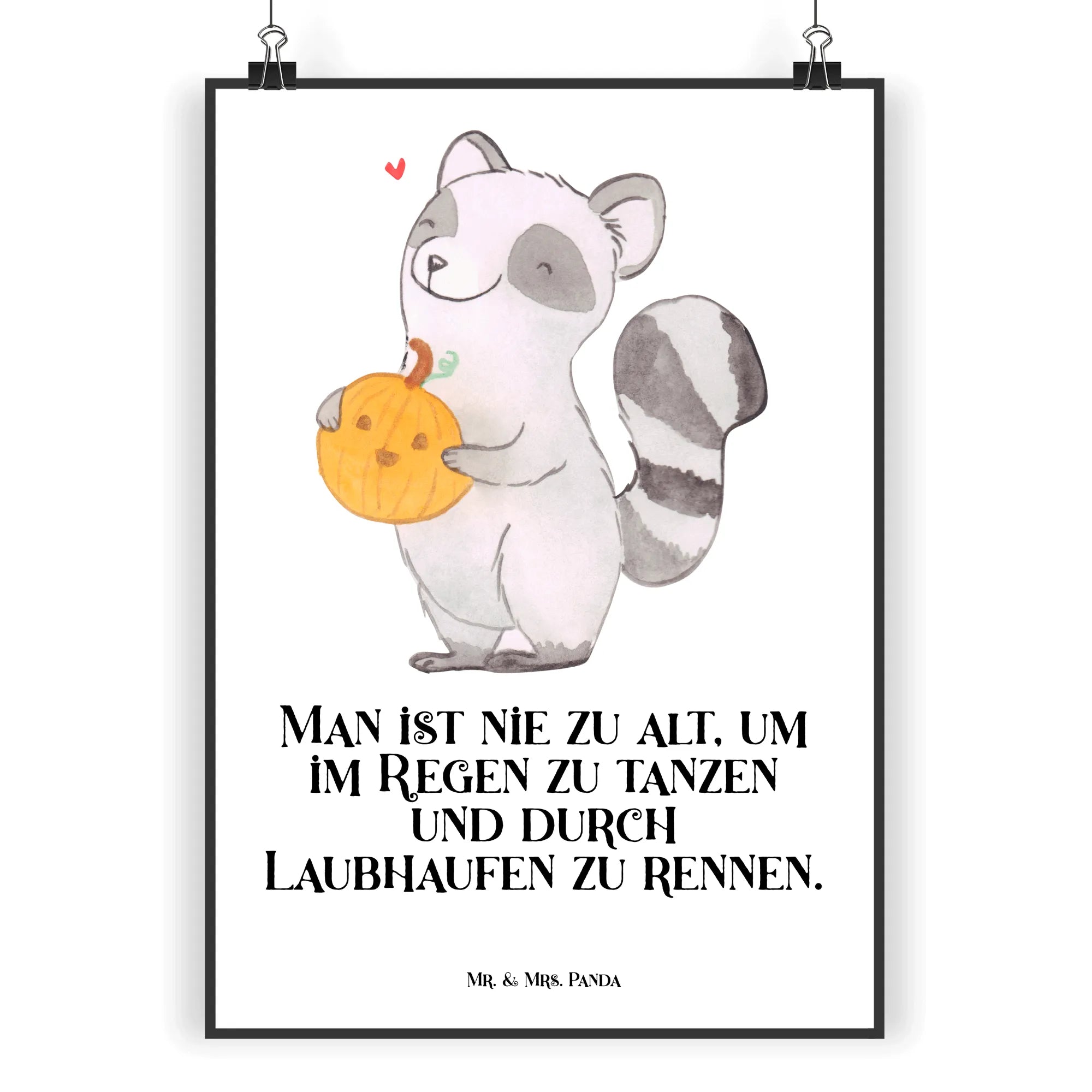 Das Poster zeigt nicht nur die verspielte Grafik eines Waschbären, sondern auch den Slogan "Man ist nie zu alt, um im Regen zu tanzen und durch Laubhaufen zu rennen.". Ob zum Martinssingen oder für Halloweenpartys, dieses Designposter verleiht jedem Raum eine besondere Note.