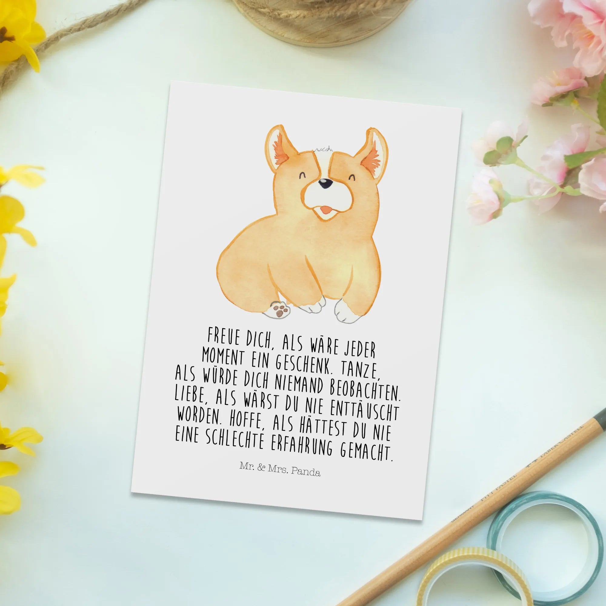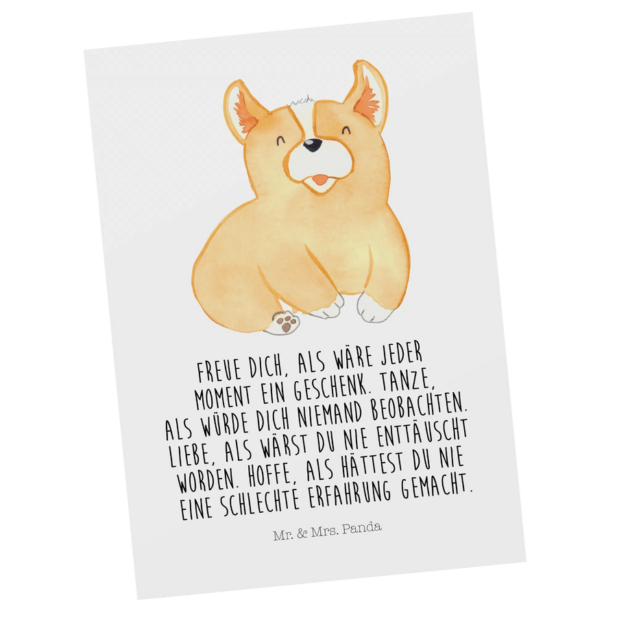 Postkarte Corgie aus der Hunde Kollektion von Mr. & Mrs. Panda – eine liebenswerte Kombination aus handgezeichnetem Motiv und motivierendem Spruch. Das niedliche Welsh Corgie Pembroke wurde von Mrs. Panda mit viel Herz in Aquarell gestaltet und trifft mit dem Spruch genau ins Herz: "Freue dich, als wäre jeder Moment ein Geschenk. Tanze, als würde dich niemand beobachten. Liebe, als wärst du nie enttäuscht worden. Hoffe, als hättest du nie eine schlechte Erfahrung gemacht." 😊