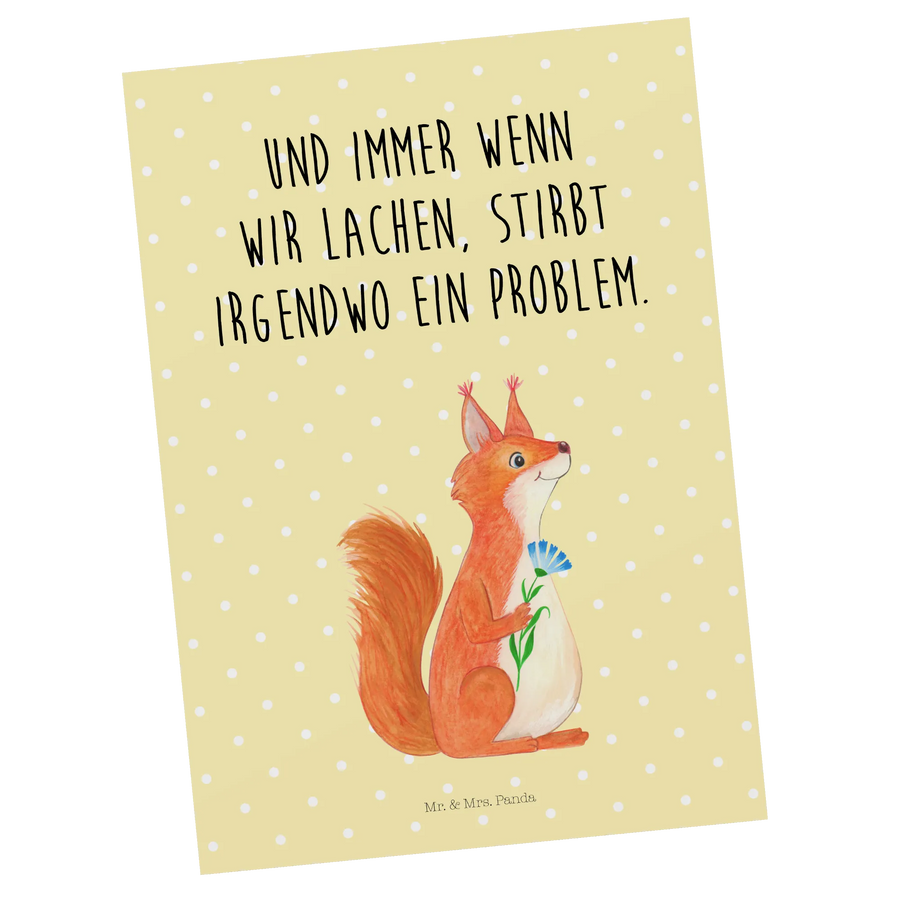 Unsere fröhliche Postkarte mit dem niedlichen Eichhörnchen und der Blume ist ein kleiner Gute-Laune-Botschafter von Mr. & Mrs. Panda. Das Motiv zeigt ein begeistertes Eichhörnchen, das eine Blume hält, und trägt den liebevollen Spruch: „Und immer wenn wir lachen, stirbt irgendwo ein Problem.“ Diese Grußkarte ist perfekt, um jemandem den Tag zu versüßen – ob als Geburtstagsgruß, Aufmunterung oder kleine Aufmerksamkeit. 😊