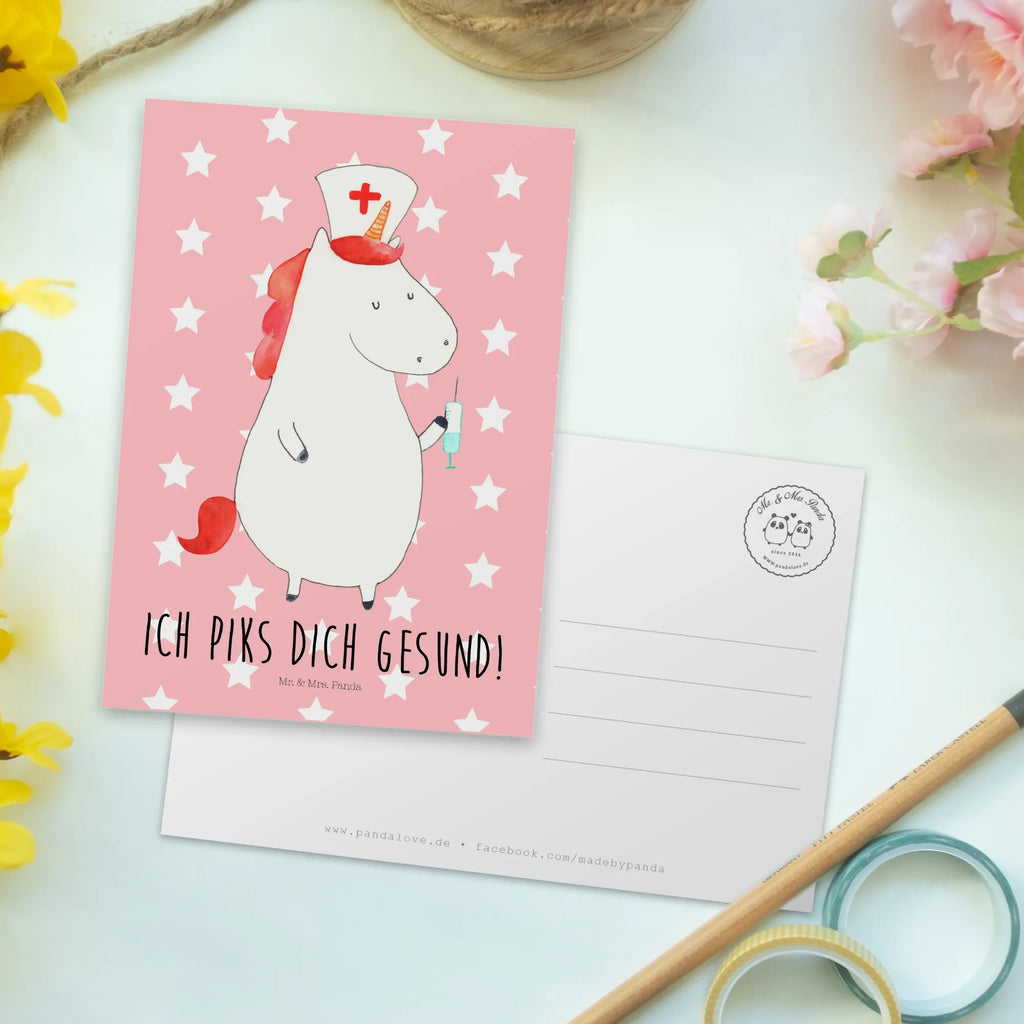Die wunderschöne Postkarte mit dem zauberhaften Motiv der Einhorn Krankenschwester aus der einzigartigen Einhorn-Kollektion von Mr. & Mrs. Panda ist das perfekte Geschenk für deine liebsten Krankenschwestern oder Pflegekräfte. Jeder kennt die phänomenale Kraft, die hinter diesen unerschütterlichen Helden des Gesundheitswesens steckt. Diese liebevoll gestaltete Karte zeigt ein niedliches Einhorn, das in der Rolle einer Krankenschwester auftritt. Mit ihrem Slogan "Ich piks dich gesund!" verleiht sie jedem Anlass eine humorvolle Note.