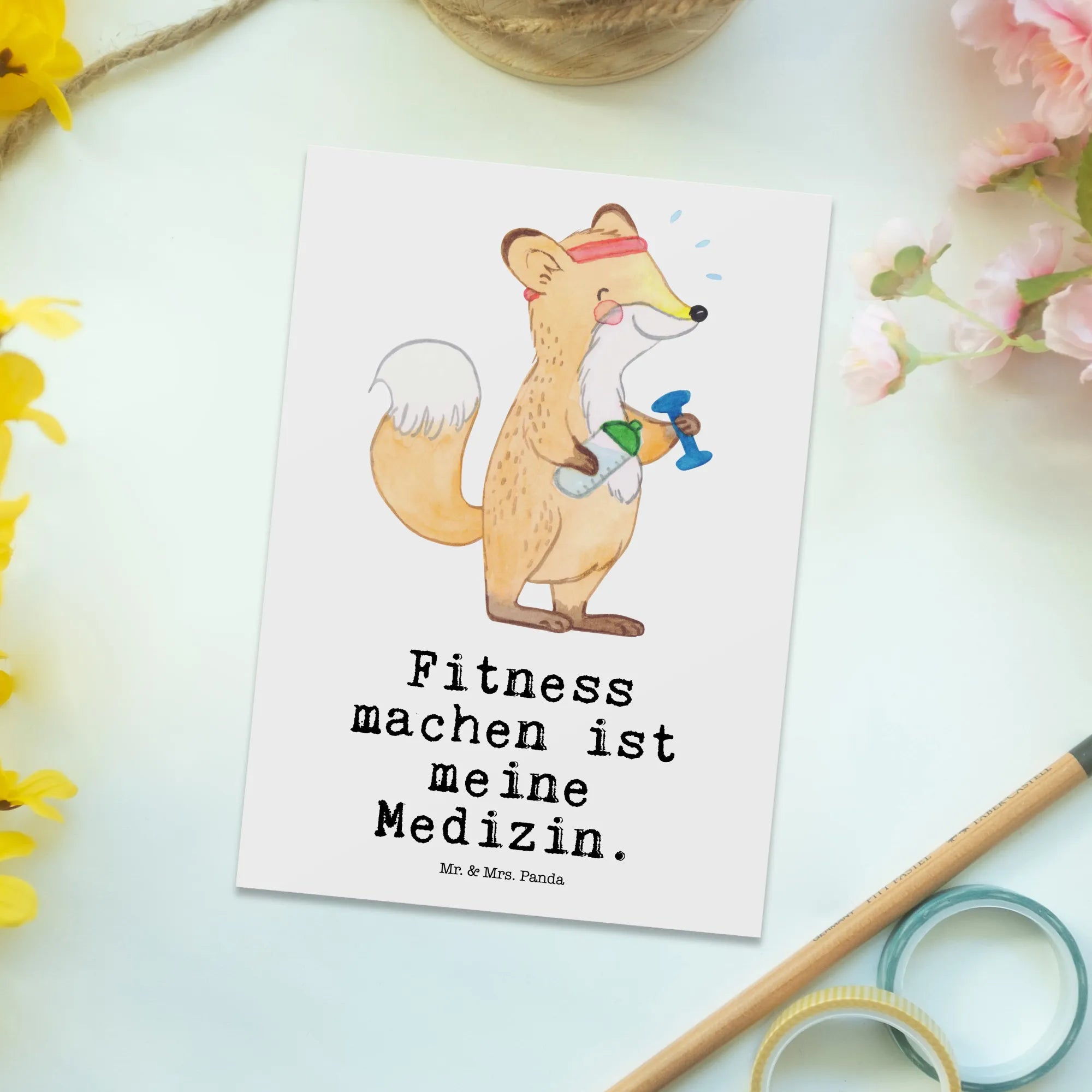 Die Postkarte "Fuchs Fitness Medizin" von Mr. & Mrs. Panda ist das perfekte Geschenk für alle Fitness-Enthusiasten und Sportler, die ihr Herz für den Sport schlagen lassen. Mit ihrem charmanten Design eines süßen Fuchses, der eifrig mit einer Trinkflasche in der einen und einer Hantel in der anderen Hand trainiert, bringt diese Karte nicht nur ein Lächeln auf die Lippen, sondern motiviert auch, aktiv zu bleiben. Der witzige Slogan "Fitness machen ist meine Medizin" spricht jeden an, der den Sport als Lebenselixier betrachtet und zeigt, dass Fitness nicht nur eine Passion, sondern auch eine Lebensweise ist. Egal ob als Geburtstagskarte, Dankeskarte oder einfach als kleine Aufmerksamkeit für einen lieben Freund – diese Karten eignen sich für jeden besonderen Anlass.